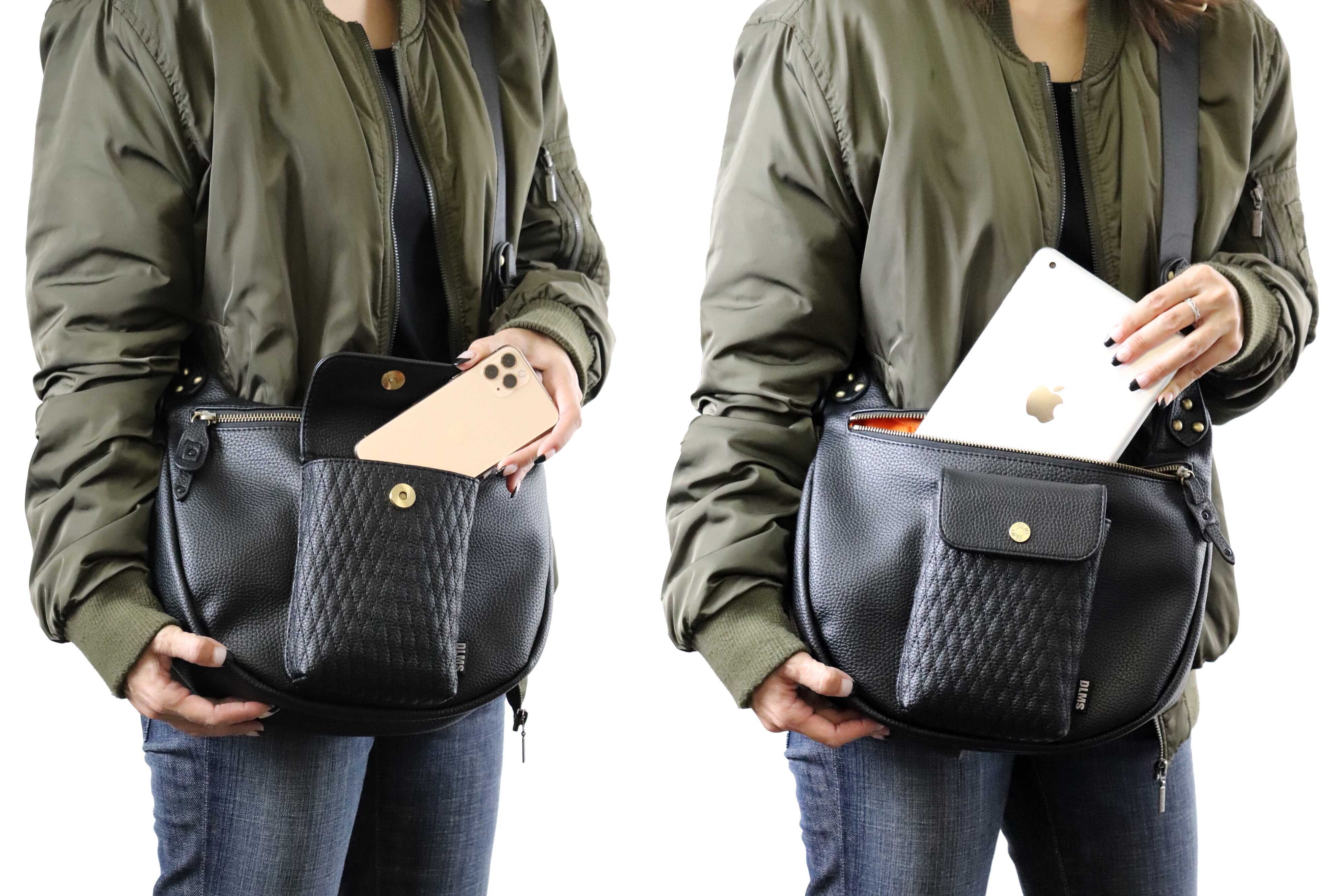 ・前ポケットには大きめのスマートフォンを収納できるサイズです。ワンタッチで開け閉めができる使いやすいポケット設計です。