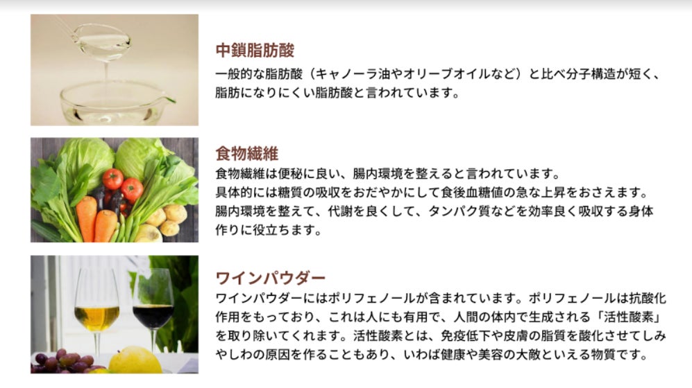 そのため、美容成分はもちろんのこと多様な効果が期待できる成分として、「中鎖脂肪酸」、「水溶性食物繊維+不溶性食物繊維」、「各種ビタミン&ミネラル」、「ワインパウダー」、「コラーゲンペプチド」などを配合しました!!