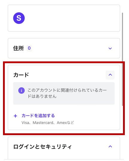 こちらの「カード」のタブから決済に使用するカード情報を入力し、「住所」のタブからお届け先住所を入力してください。