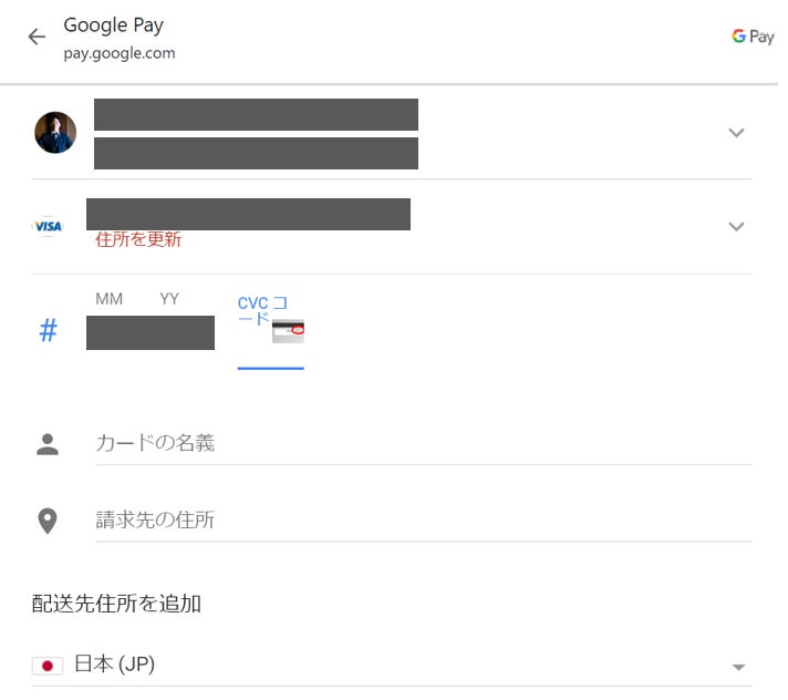 決済方法からGooglePayを選択し、入力画面へ移動します。