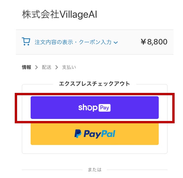 支払い方法選択画面から「Shop Pay」を選択ください。
