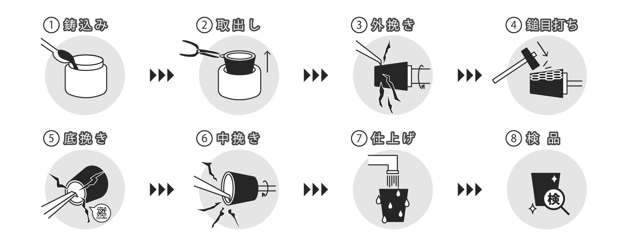 ①鋳込み…溶けた錫を鋳型に流し込み、大まかな形を作ります。 ②ロクロ挽き…ロクロに取付け、カンナを手で操って側面をロクロ挽きします。(底は職人がロクロ挽きします。)