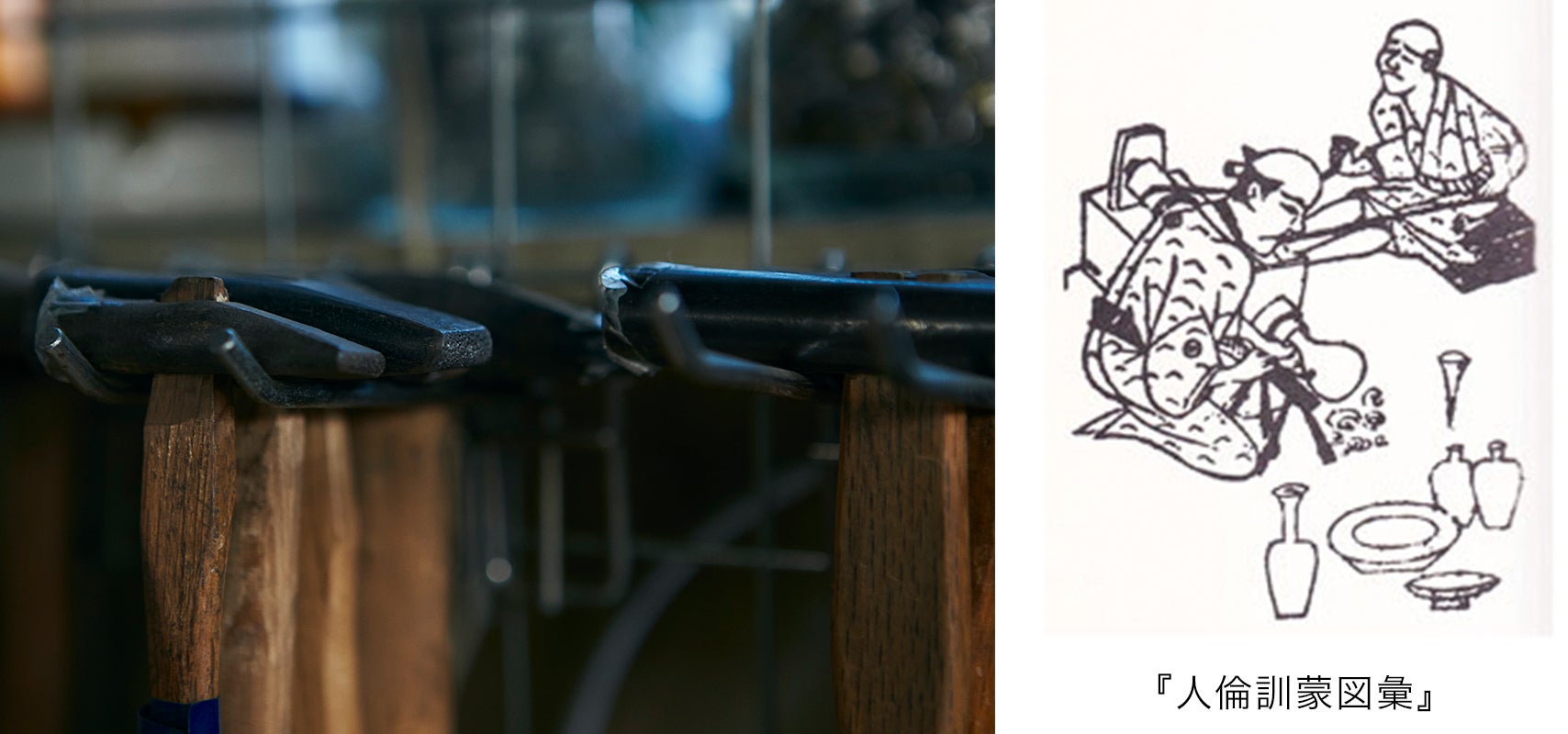 『人倫訓蒙図彙』(元禄3年1690)には、手引きロクロを使用して徳利や鉢・皿などを制作する姿が描かれ残されています。