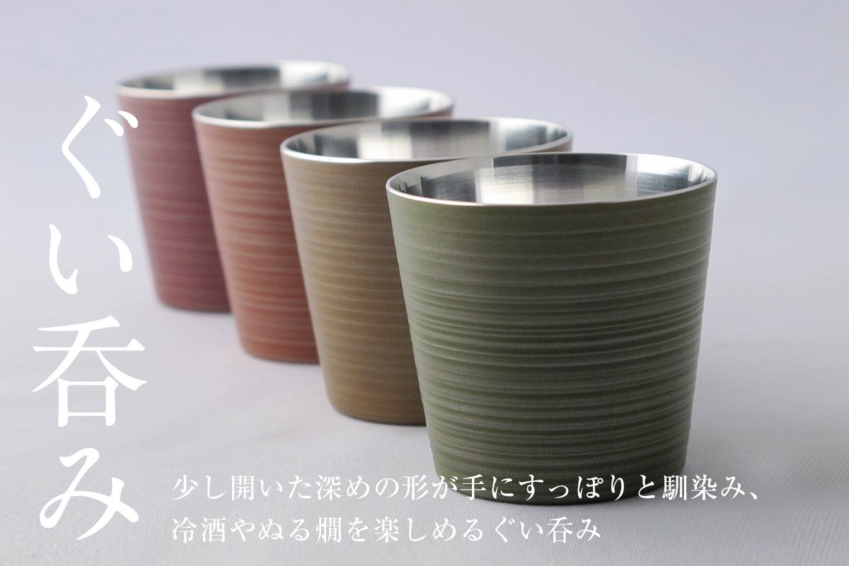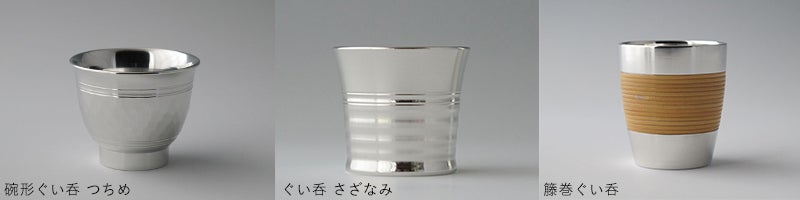 ぐい呑 さざなみ…「さざなみ」模様は一つ一つ手挽きロクロで施しているため、同じ波長のものはありません。金属でありながら柔らかな優しい手触りです。