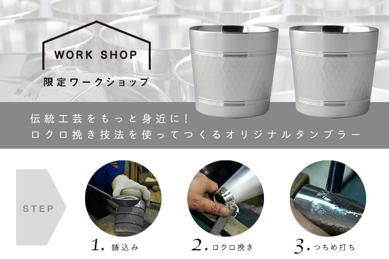 ワークショップで「モノづくりの楽しさや喜び」を通じ、錫の器のことやロクロ挽きの技法について知ってください。