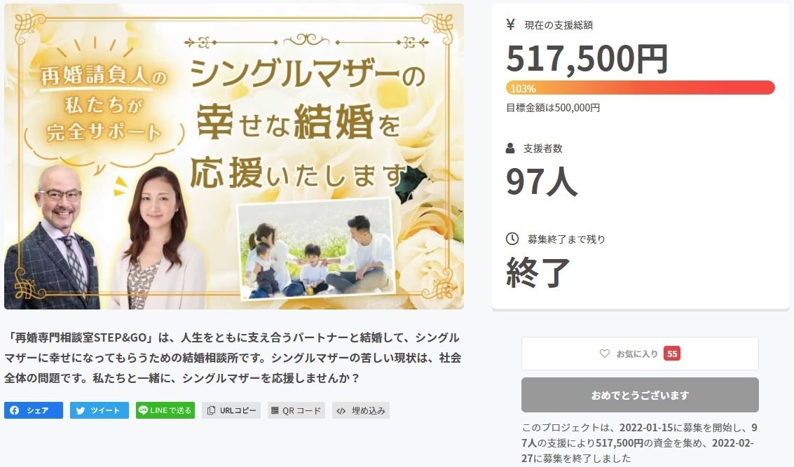 2022/02/28 12:34みなさま、こんにちは!再婚専門相談室STEP&GOの再婚カウンセラー 愛間ユウジと三鈴かれんです。昨日で私たちのクラウドファンディングは終了いたしました。最終日の残り3時間というところで、目標金額の500,000万円を達成いたしました!みなさまお一人おひとりのご支援が嬉しくて、最終日に続々といただけるご支援に涙が止まりませんでした。みなさまからのご厚意をシングルマザーとそのお子さんのために大切に使わせていただきます。今、身の引き締まる思いです。クラファンはゴールではなく、スタートです。シングルマザーが婚活を通して幸せになれるよう、全力を尽くす所存です。改めて、応援いただいたみなさまに心から御礼申し上げます。 もっと見る
