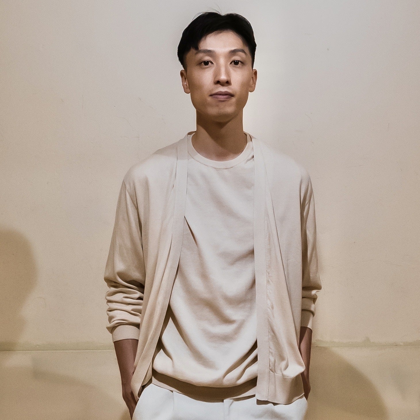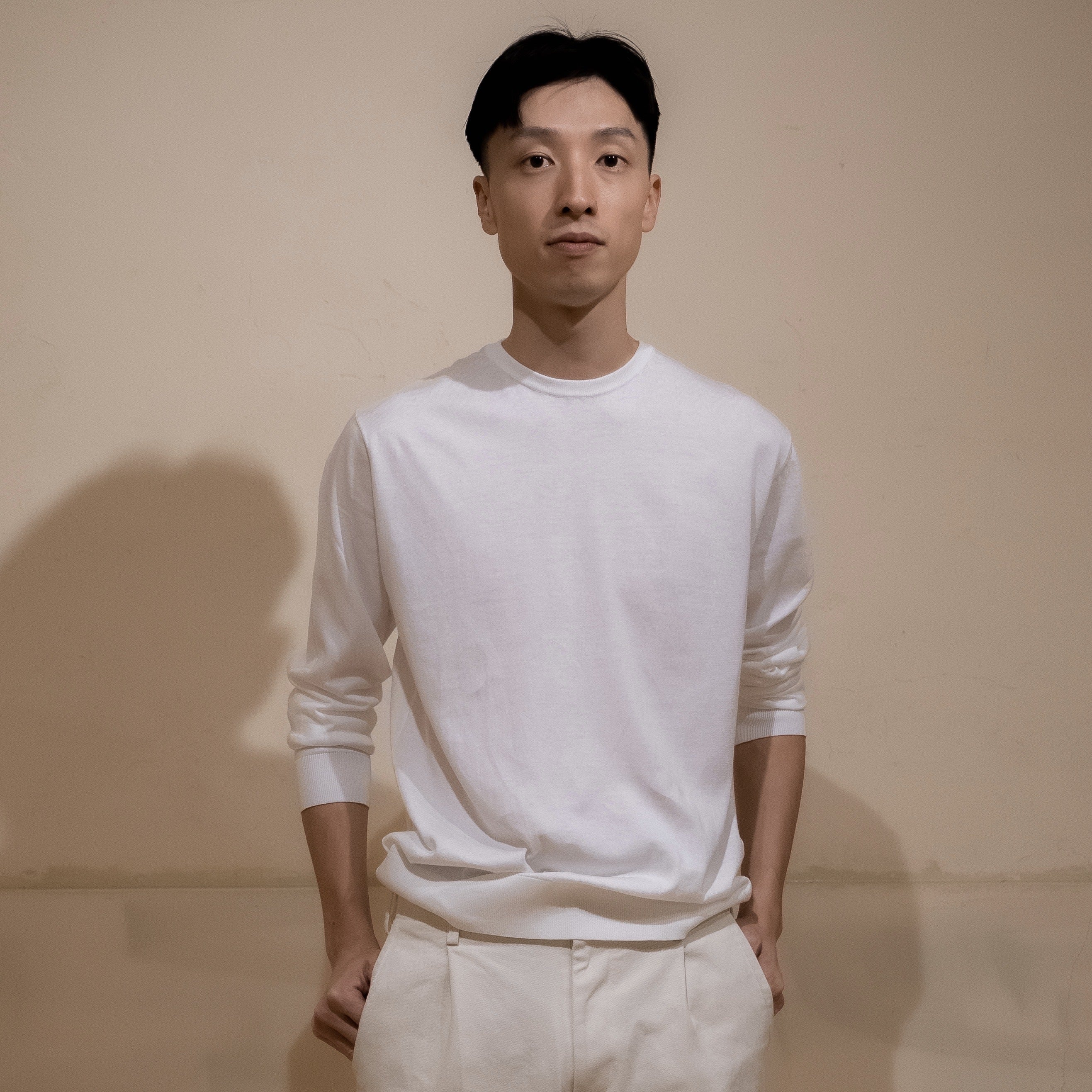 男性モデル (ピュアホワイト無染色きなり)は175cmでサイズ3を着用しています