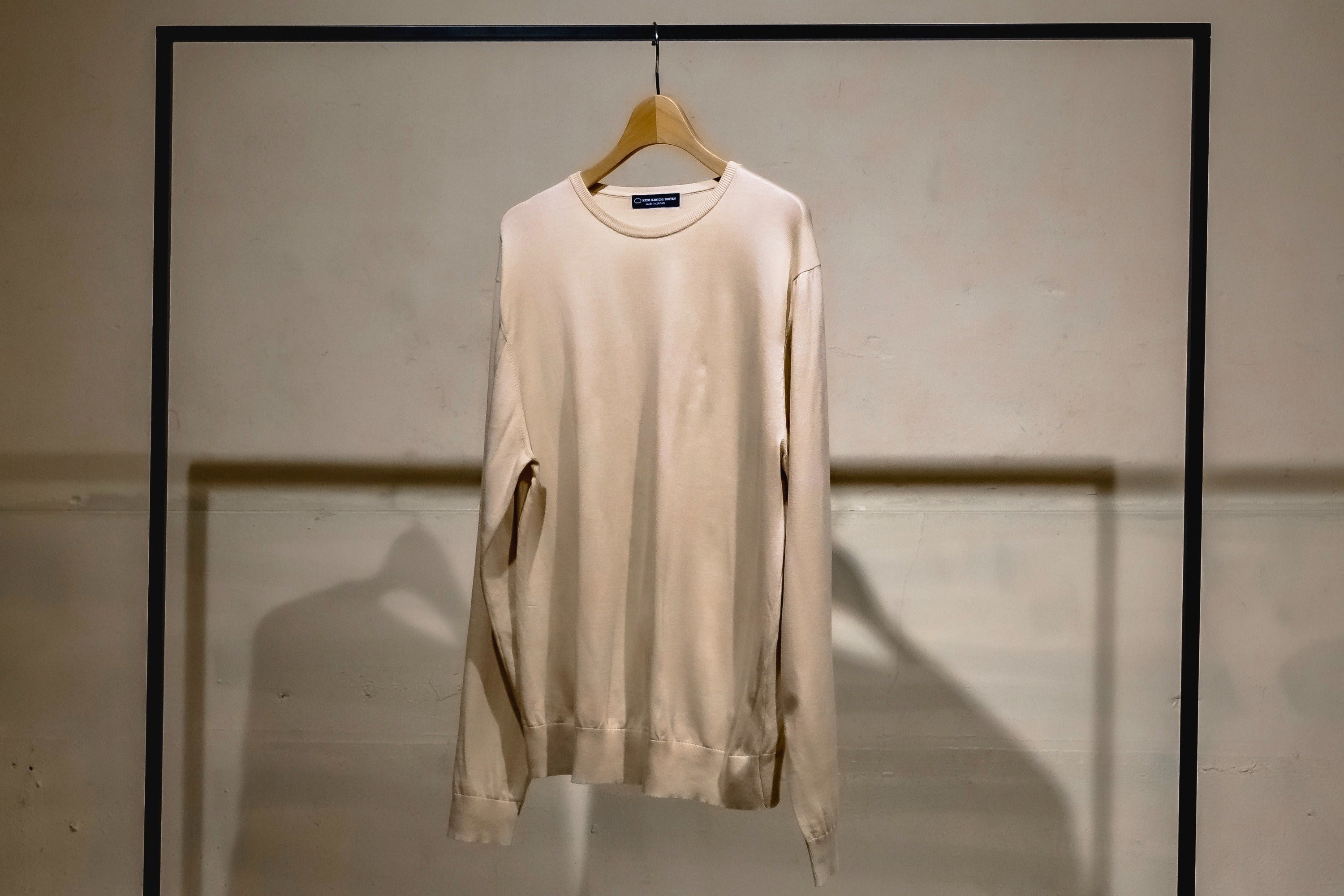 吊り編み機によってゆっくりと糸にストレスをかけずに編むことで独特の風合いになっています。