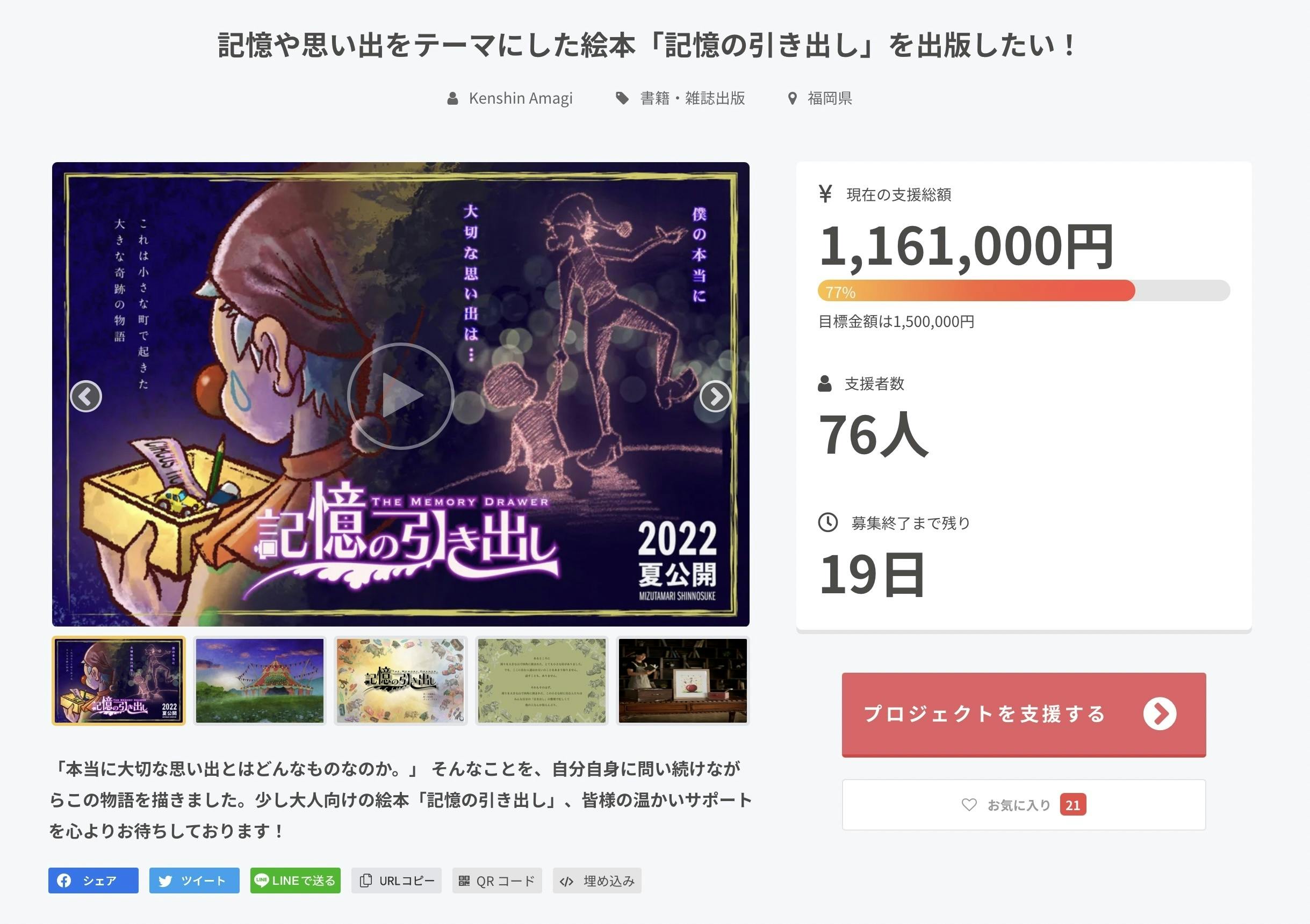 皆様こんにちは!「記憶や思い出をテーマにした絵本『記憶の引き出し』を出版したい!」プロジェクトオーナーの天城剣心です。