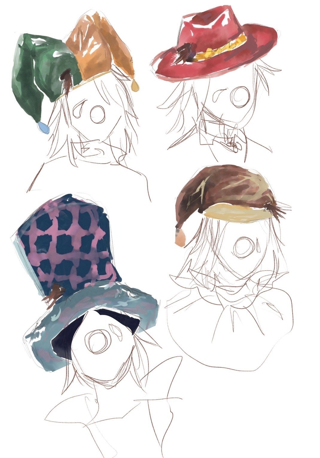 ▲物語に出てくるピエロの帽子のデザインのスケッチです。