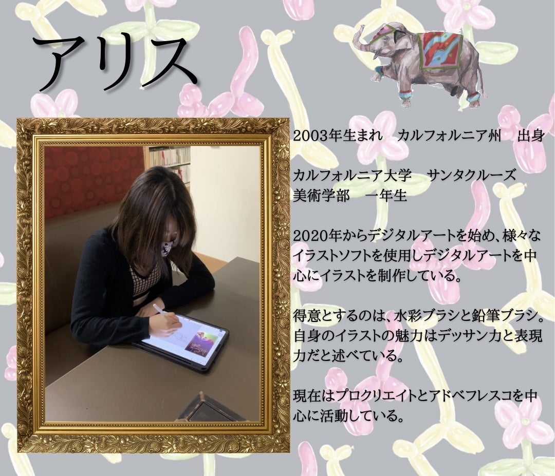 グッズ担当はアリスさんです。たくさんの可愛い絵を描いていただいたので、それを元にほとんどのグッズを作成しています。