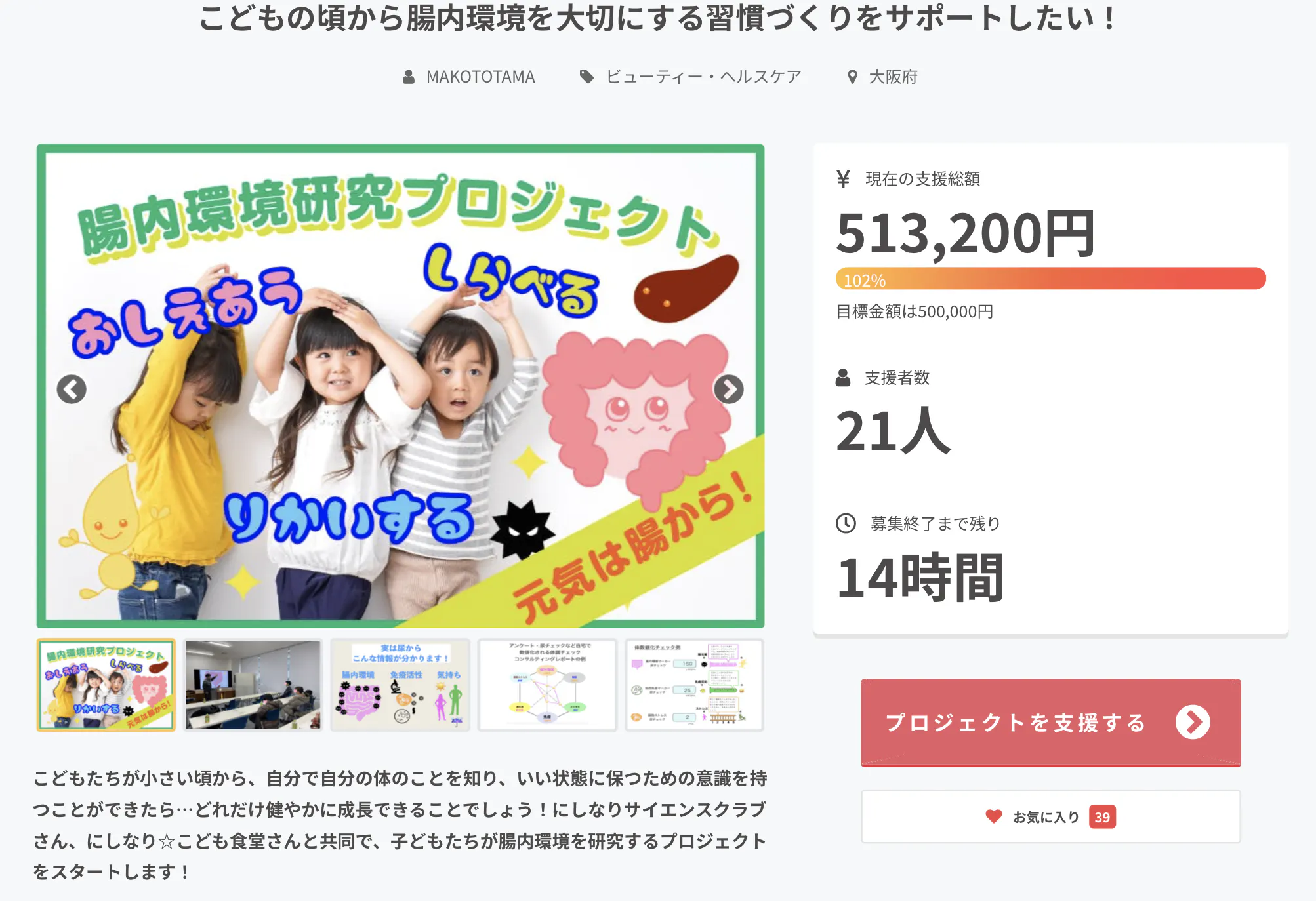 2022/03/30 10:03残り12時間となったこどもたちとの腸内環境プロジェクト目標金額達成しました。このページを見てくださってり、紹介してくださったりと応援してくださった方々リターンを通じて支援してくださった方々のおかげです。ありがとうございます!残り時間少ないですがネクストゴール75万円75万円の到達したら、、、企画ZOOMでご挨拶可能な方へお礼として基礎からわかる免疫講座をプレゼントいたします。あと半日で+24万円で、プロジェクトの可能性が拡がります。よろしくお願いいたします。こども食堂では、サイエンスクラブ に参加していない子供たちもいます。一人一人にあった有形無形の何かを手渡していきたいものです。 もっと見る