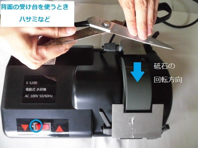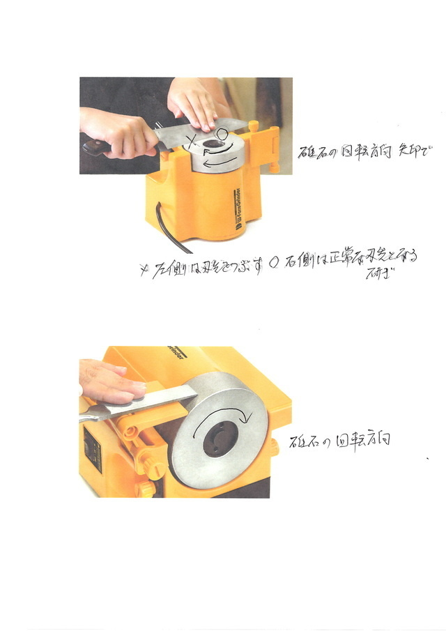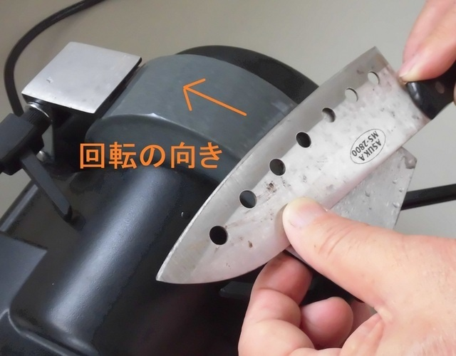 強く押さえると砥石の回転力で研ぐ刃物が矢印の方向に動いて研げません。