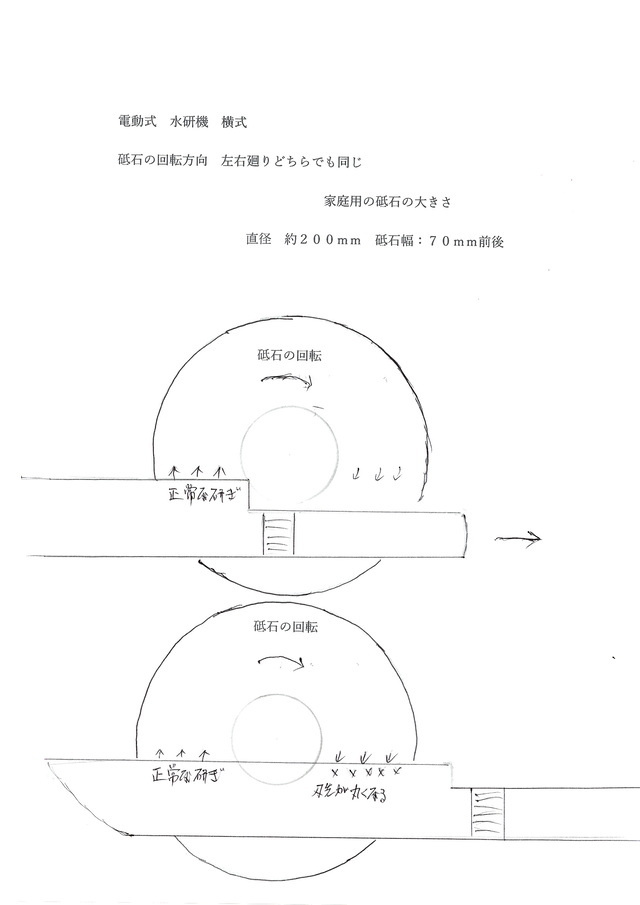 横式では左側(片側)は正常な研ぎですが全体を研ぐには右に移動させねばなりません。