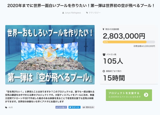 こんにちは!2020年までに世界一おもしろいプールを作るプロジェクト【東京プール研究室】室長の西川です。 クラウドファンディング終了までとうとう残り8時間となりました!現在約310万円で残り20万です!引き続きどうぞ宜しくお願い致します! さて、連続して応援メッセージという名の未来のプールの妄想ビデオをいただいたのでご紹介したいと思います。 環境問題に繋げられるというアイディアは素晴らしいですね!!スイマー目線だとこの角度からの社会問題へのアプローチは思いつきません!私も目からウロコでした。 吉田さんにはすこしプールの可能性をお伝えしただけなのに、「こういうことできるね」「これもできちゃう!」と湯水のごとくアイディアが出てきていました。 イベントの企画者ということもあって、妄想するのが得意だとは言っていましたが、私は吉田さんとの会話ですごく未来を感じワクワクしました。 日本のこういった妄想大好きな方たちがプールの可能性とか面白さを知ってしまったらどうなるんだろうと。私が予想だにしなかったとんでもなく素敵なプールが出来上がってしまうのではないかと。 あ〜未来早くきてほしい♡笑 東京プール研究室は皆さんの妄想を集め、ひとつづつ現実にし、プールの中をより楽しく、より魅力的にすることで人と笑顔がもっとプールに集まる文化の創造を目指します。 残り8時間!引き続きご支援、応援のほど、どうぞ宜しくお願い致します! 過去にも面白い未来の面白いプールの妄想を応援メッセージにして詳細させていただいておりますので、是非ご覧ください☆Vol.1 源純夏さん(シドニー五輪競泳銅メダリスト)https://camp-fire.jp/updates/view/11480Vol.2 山田沙知子さん(シドニー五輪競泳ファイナリスト)https://camp-fire.jp/updates/view/11532Vol.3 山本晴基さん(近畿大学水上競技部ヘッドコーチ)https://camp-fire.jp/updates/view/12239Vol.4 山本貴司さん(アテネ五輪競泳銀メダリスト)https://camp-fire.jp/updates/view/12279Vol.5 中西悠子さん(アテネ五輪競泳銅メダリスト)https://camp-fire.jp/updates/view/12301 Vol.6_高畑えみさん(競泳元日本代表)https://camp-fire.jp/updates/view/12327 ***********************************☆初めてご覧になる方へ☆2020年までに世界一面白いプールを作るプロジェクト。第一弾は世界初の空が飛べるプール!に挑戦しています。https://camp-fire.jp/projects/view/5226***********************************☆クラウドファンディングで上手く登録できなかった方へ☆銀行振込も受け付けております。三菱東京UFJ銀行 東長崎支店 普通 1026685 ニシガワジュンヤ後日ポストカードをお送りするので住所を聞く必要があるので、振り込んだ事をダイレクトメッセージでお知らせください。***********************************【CAMPFIRE mag】に注目のプロジェクトとして取り上げていただき、素敵にまとめていただきました☆http://mag.camp-fire.jp/14593/***********************************支援の仕方がわからない方はこちら分かりやすくご紹介しております♫https://camp-fire.jp/updates/view/11310***********************************現在の支援者数=138人現在の支援総額=3,104,000円