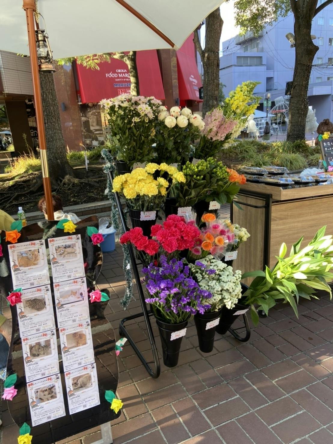 ねこちゃんの顔のピンポンマムは道行く人々に「かわいい!」と