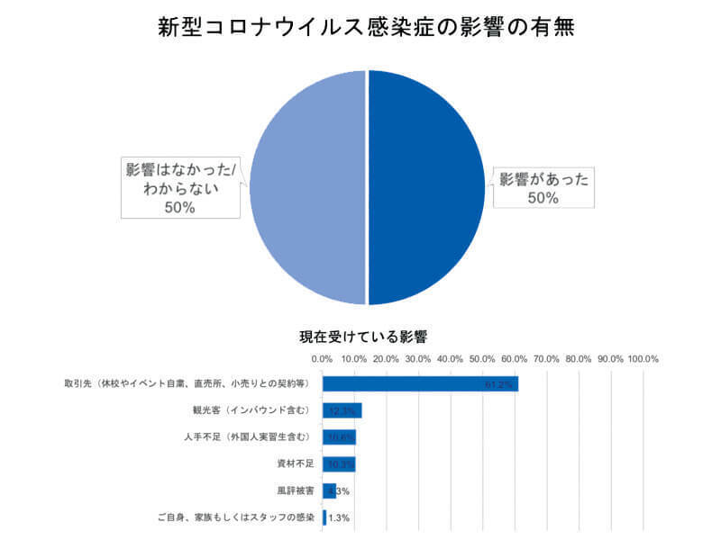 現在受けている影響は「取引先の減少」、「外国⼈実習⽣の⼊国規制による人手不⾜」、「観光需要減」、また、影響があったと答えた農家のうち、取引先の休校やイベント⾃粛、直売所や⼩売店舗との契約が減少したと答えたのは60%以上におよび、人手や資材の不⾜と答えたのも20%ほどとなっていました。
