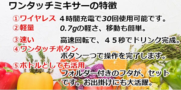 素材の調理(焼く・煮る・蒸す) はさまざまですが、火を通した場合、栄養分は半減もしくはそれ以下にしてしまうとよく言われます。野菜などの皮は栄養価が非常に高いと言われ、繊維質も豊富で腸内環境を整えます。ミキサーを利用することで、100%近い栄養価を保った状態で摂取することができます。忙しい朝にもドリンク一つで体内のバランス作りを手助けし、爽快な1日の始まりです。また珍しい野菜にも非常に便利です。調理方法が分からない・レシピ見たけど面倒。そんな場合でも、ミキサーを利用することで新しい味を楽しみ、食事の幅を広げます。