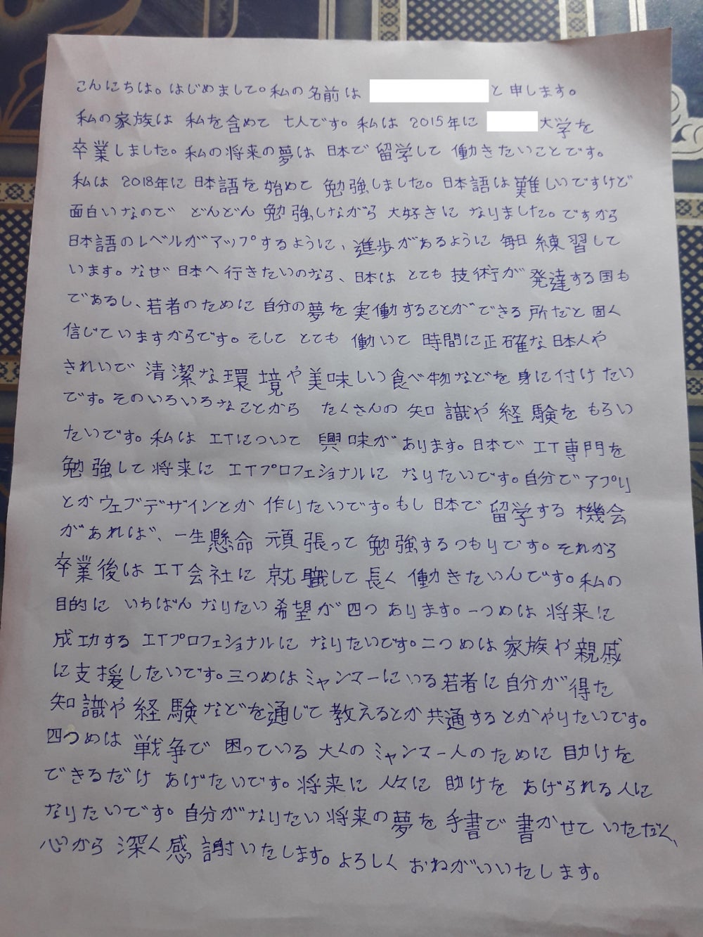 国や家族を背負う気持ち、学ぶ意欲など、全員が、それぞれの想いをのせて書いてくれました。