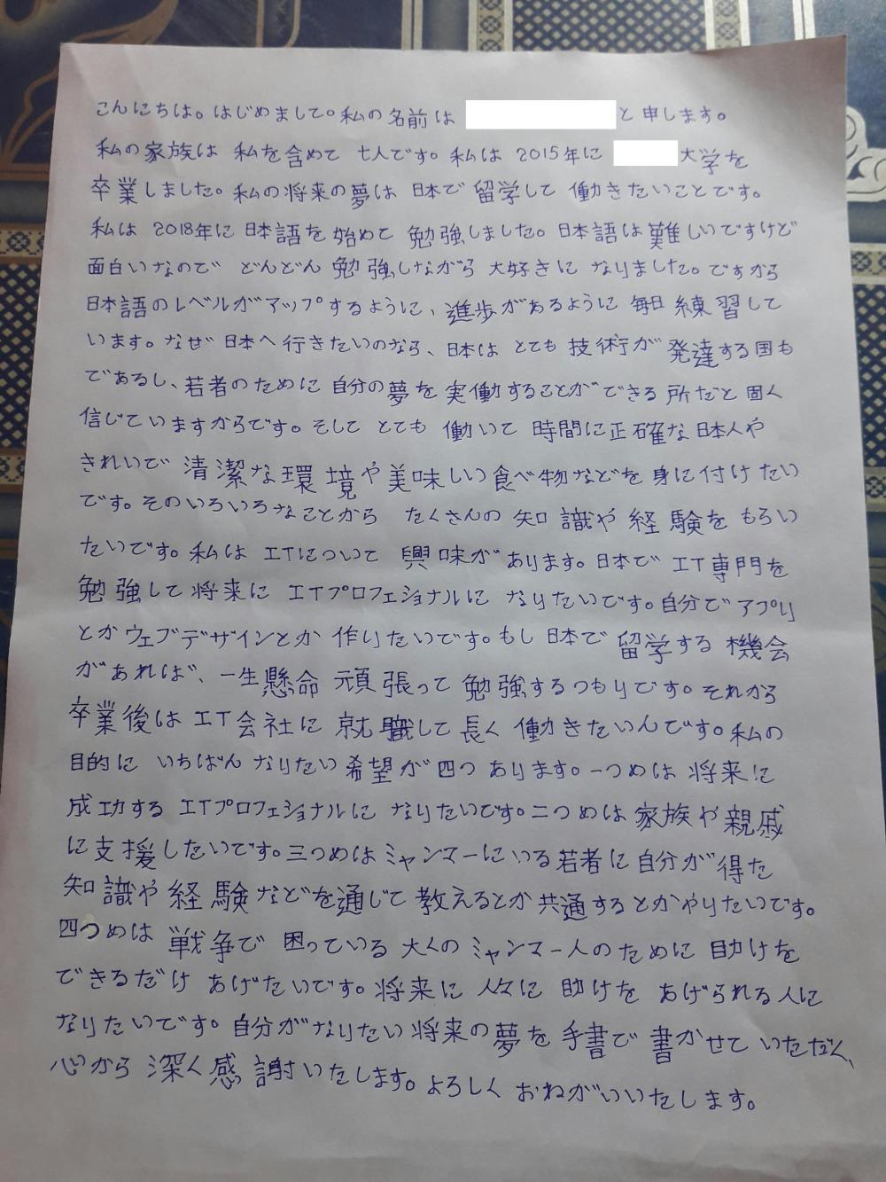 国や家族を背負う気持ち、学ぶ意欲など、全員が、それぞれの想いをのせて書いてくれました。