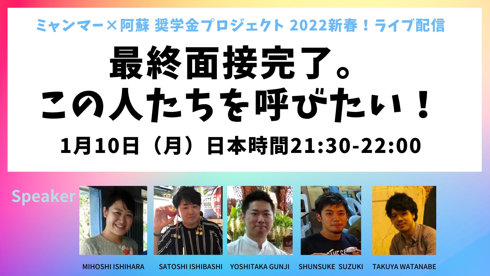 皆様、こんにちは!「ミャンマー×阿蘇 奨学金プロジェクト」実行委員です。報告が遅れましたが、2022年4月6日にミャンマー留学生を受け入れる熊本県のIdea IT College Asoで入学式が行われ、4月11日から授業が始まりました!Idea ITCollegeの入学式、ミャンマーの国旗もしっかりと掲げられています!クラウドファンディングでご支援いただいた4,122,000円(2名分)に加えて、企業や団体・個人の方からもご寄付をいただき、合計4名のミャンマー留学生の入学が実現しました。応援いただいた皆様、本当にありがとうございます。これから2年間、2名は「観光」、2名は「IT」を学びます。入学式は、本来であれば、ミャンマー留学生にもリアルで参加してもらいたかったのですが、まだ日本への入国許可がおりていないため、ミャンマー国内からオンラインでの参加となりました。現在も、入国許可を待ちながら、ミャンマー国内でオンラインで授業を受けています。今回は、下記2点についてご報告させていただきます。------------------------------------------------------------------(1)4名がどんな学生生活を送っているのか(2)クラウドファンディングのリターンに関するお知らせ------------------------------------------------------------------入学前は、4名ともミャンマーの異なる地域に住んでいましたが、今は、オンラインで授業を受けられるように最大都市ヤンゴンに引っ越して共同生活を送っています。地方の自宅では、インターネットの接続があまりよくない、停電が頻発して授業に参加できないという問題がありました。ヤンゴンでの生活を心配する保護者もいましたが、Wifiや発電機を使えるアパート、生活費が不安な人へはアルバイトも準備して、安全面にも配慮した環境を整え、4名全員がヤンゴンへ来ることになりました。専攻ごとにオンラインで授業を受けています(学生の安全性を考慮して画像は加工しています)月曜日から金曜日は、早朝から勉強。日本とミャンマーでは2時間半の時差があるため、ミャンマー留学生は朝5:30頃に起床し、6:30から学校のホームルームに参加、7:00には授業が始まるという生活を送っています。(まだ早起きの生活に慣れていない学生は、少し眠そうです・・・)そして、Idea IT Collegeの授業とは別に、来日に備えて「ビジネス日本語」の勉強も。毎日新しい単語30個と問題集に取り組み、週に3回ほど実施している勉強会で、分からない単語や表現を、プロジェクトの日本人メンバーが解説しています。(学生からの要望で始めたのですが、勉強熱心で頭が下がります・・・)ビジネス日本語は、ビジネスの基礎知識が求められたり(例えば損益分岐点など)、ビジネス特有の言葉があったり(例えば「もう少し勉強して」や「アイミツ」など)、ミャンマーの学生にとってはとても難しいようですが、頑張っています。これから彼らが日本で働くことを想定して、プロジェクトメンバーも一生懸命サポートしていきたいと思います。リターンを楽しみにしてくださっている方へは大変申し訳ないのですが、入国の遅れに伴い、リターンの提供時期を一部見直しさせていただきました。ご理解のほど、よろしくお願い致します。■ミャンマー留学生からのお手紙 ※対象:3,000円以上ご支援の方ミャンマーの学生が日本へ来ることが出来たタイミングで、ご登録いただいたメールアドレスへお届けしたいと思います。もう少しお待ちください!■活動報告書(1回/年×2年)※対象:3,000円以上ご支援の方2023年3月頃までに、1回目の報告書をご登録いただいたメールアドレスへお届けする予定です。■オンライン活動報告会(2回/年×2年)※対象:5,000円以上ご支援の方2022年5月 17日 (火) 21:00〜22:00に活動報告会を予定しています。詳細は、対象の方へ別途ご案内させていただきます。■成長見守り隊Facebookコミュニティ ※対象:10,000円以上ご支援の方対象の方へは、4月13日〜14日にご登録いただいたメールアドレスへ案内を送付しております。Facebookコミュニティでは、日々の学生の様子や自己紹介など投稿していきますのでお楽しみに!もし、対象だが案内が届いていないという方いらっしゃいましたら、お手数ですが、下記URLにアクセスして、参加リクエストをお願い致します。https://www.facebook.com/groups/619031935983752/■ミャンマーコーヒー/ハーブティー ※対象:30,000円以上ご支援の方4月中に発送予定にしております。ミャンマーを少しでも感じながら、ほっと一息ついていただけたら嬉しいです。■オンライン学校見学会および交流会 ※対象:100,000円以上ご支援の方2022年6月頃を予定しておりましたが、まだミャンマー留学生の入国が出来ていないため、延期とさせてください。実施時期が確定しましたら、対象の方へメールにてご案内させていただきます。■実行委員とミャンマーを語る券(オンライン作戦会議) ※対象:300,000円以上ご支援の方ミャンマー留学生の入国後、ご登録いただいたメールアドレスへ日程調整のご連絡をさせていただきます。お話できることを楽