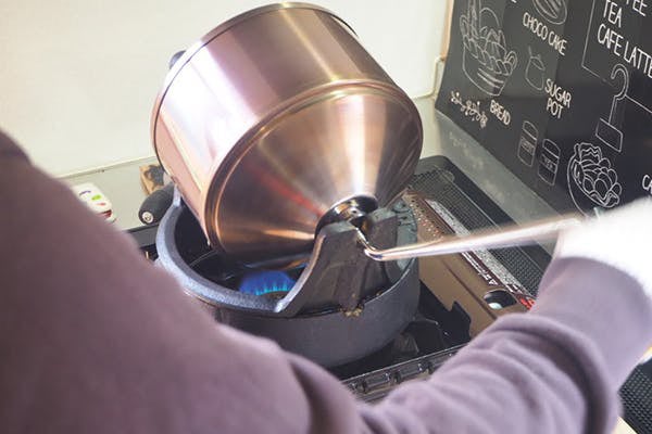 焙煎は、愛知県のコーヒー修行時代に独学ではじめました。最初に使った道具は「銀杏煎り器」。その名の通り、銀杏を煎る道具ですが、コーヒー豆の焙煎にもよく使われる道具です。