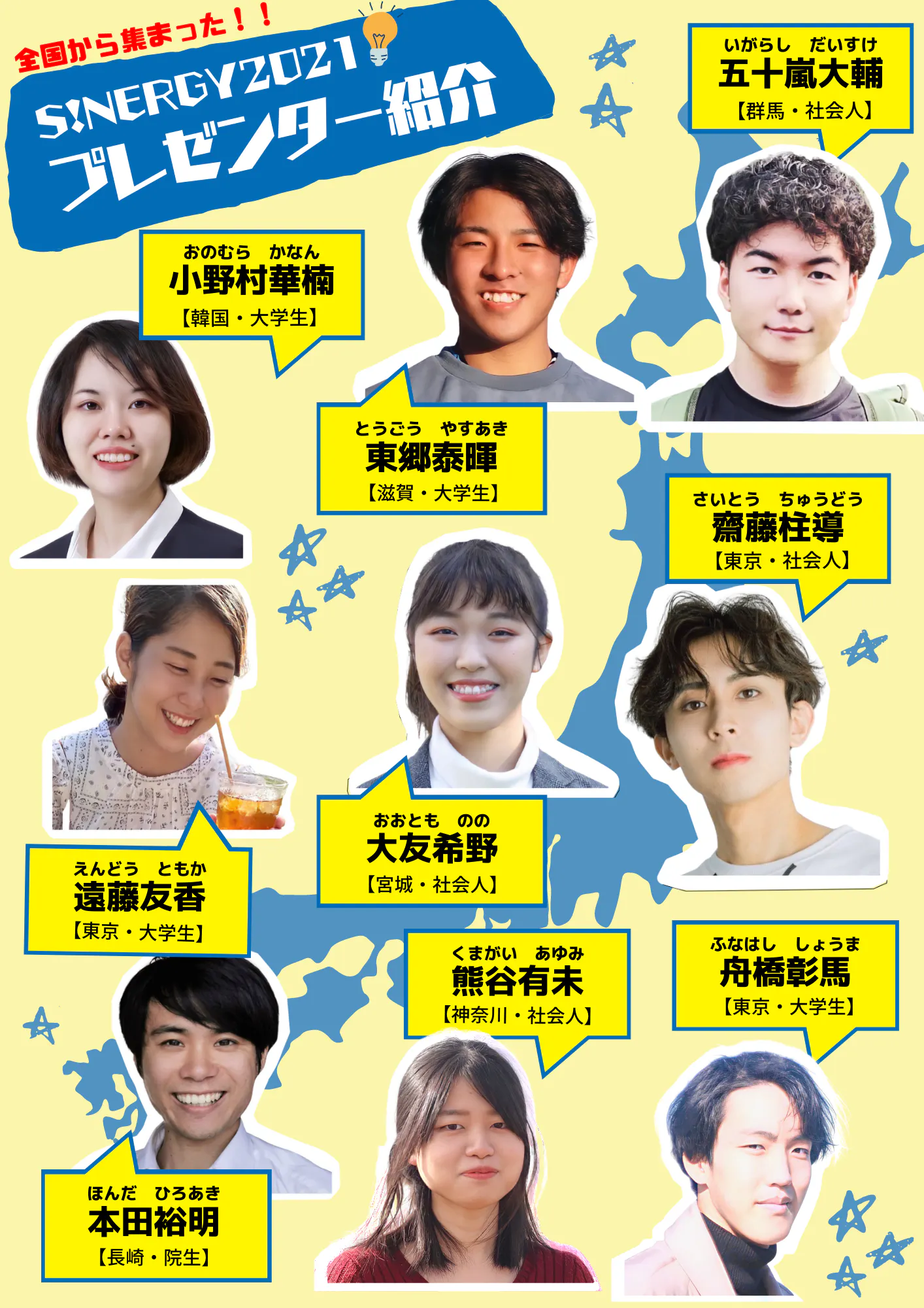 今回は1月8日から10日にかけて行われるプレゼンテーション・イベント『S!NERGY2021』のプレゼンター情報をお伝えさせていただきます。高校生から大学生、社会人まで総勢10名が社会課題を解決するためのアイデアを発表します。