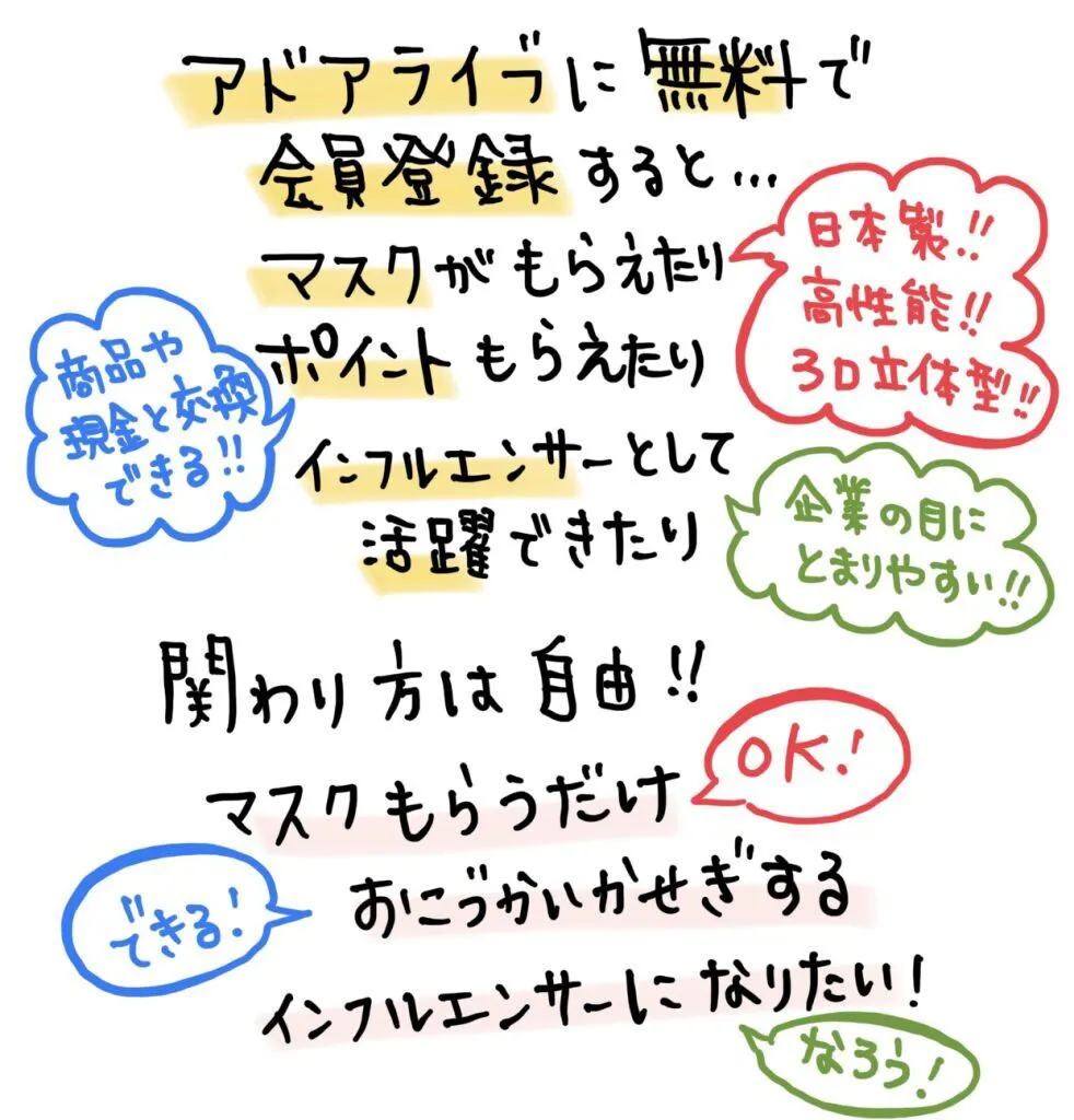 アドアライバー(アドアライブに登録した人)になると、高機能なマスクがもらえてインフルエンサーを目指しながらお小遣い稼ぎができちゃいます。そしてそのアドアライバーを支えるのは自社サービスの認知を広げたい広告主(事業者)さんです。