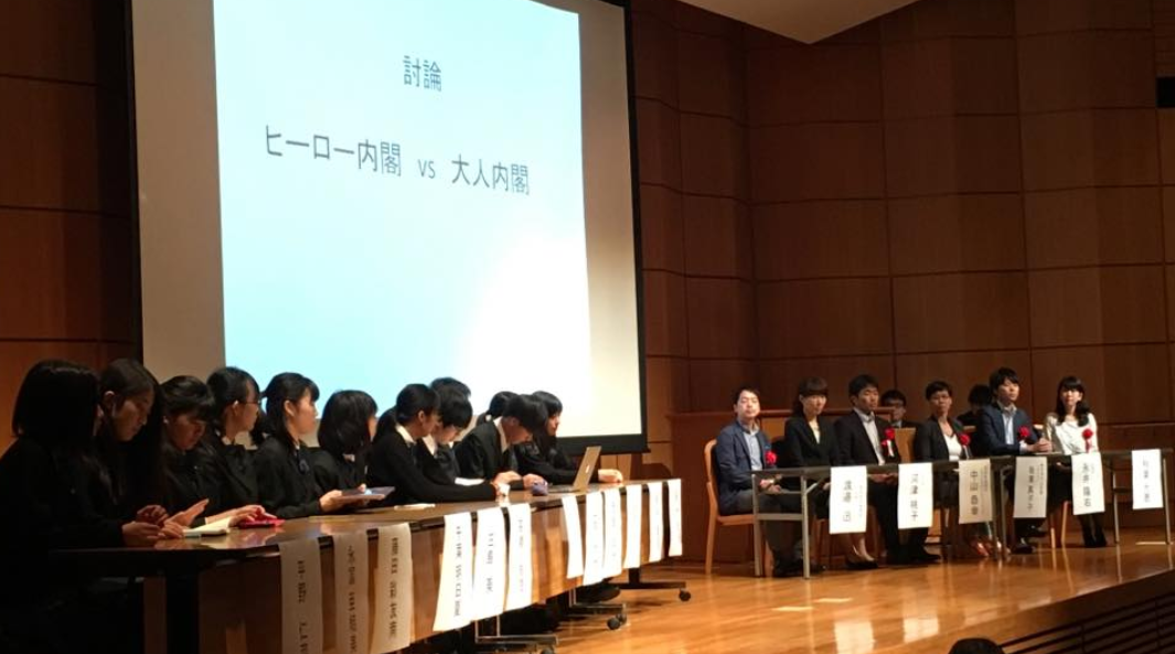 ヒーローアカデミー第1期生たちによってつくられた「ヒーロー六法」について、弁護士・医師・文科省官僚・実業家・NPO代表によって構成された「大人内閣」と議論