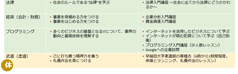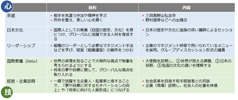将来、日本のイノベーションリーダーとして活躍するために触れておくべき法律や経済、国際教養等を一流の講師から学びます。それに加えて、ボランティア活動を通じて社会と触れることで「正義感や慈愛の心」を学び、武道や茶道を体験することで自らの「礼節」「身体」を磨きます。実体験を伴う「心」の教育に重きを置くのが特徴です。