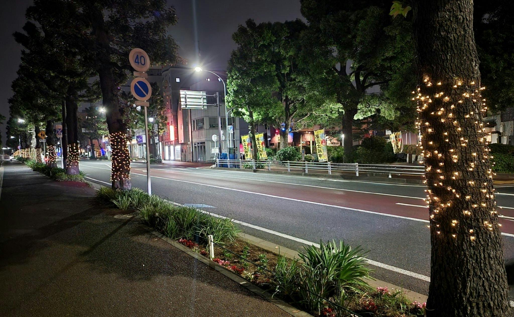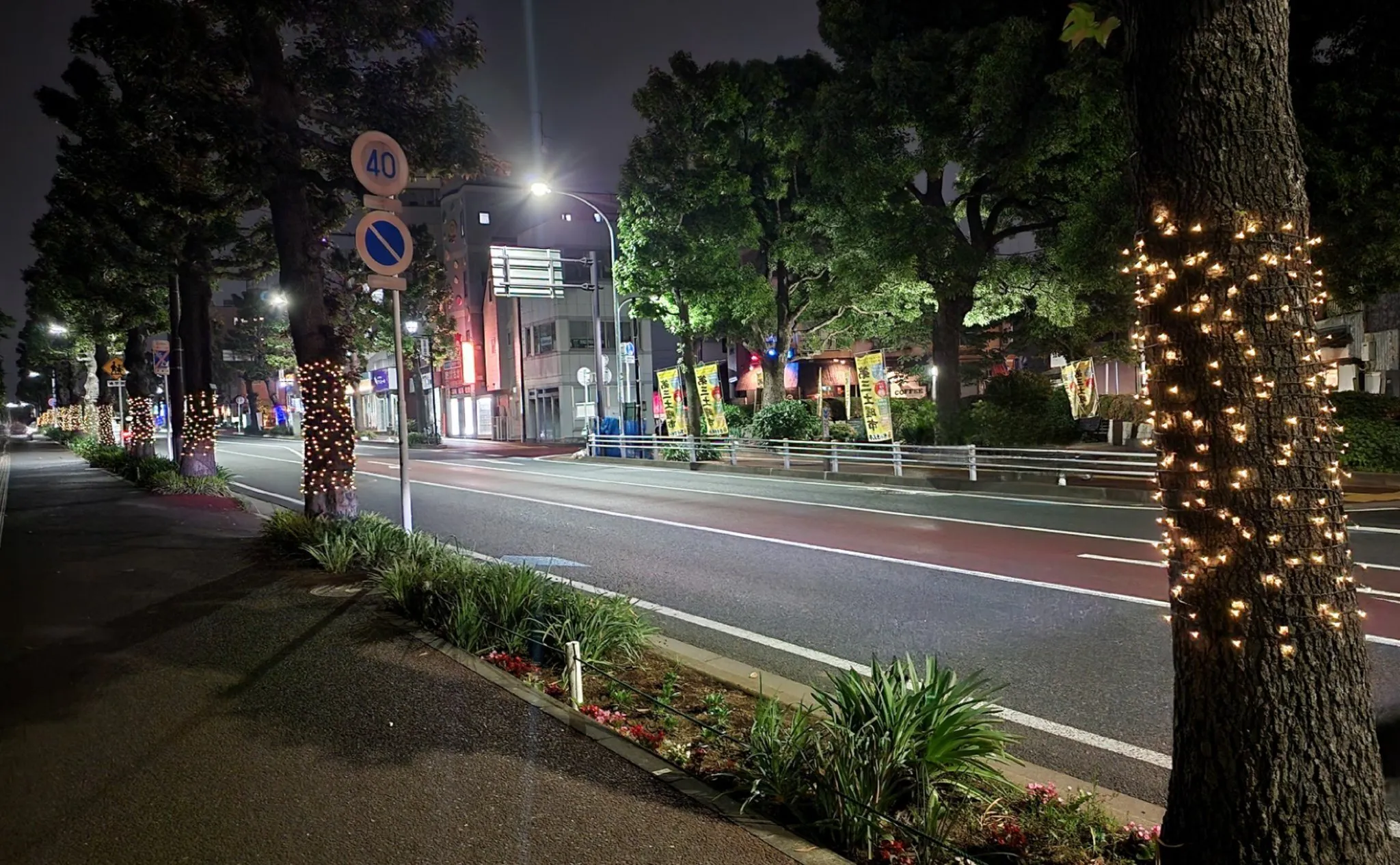 この画像は、第169回「第3土曜市」前夜(5月20日(金))の様子です。ふくろう広場には幟旗が立ち、植栽帯には千葉市緑政課からいただいた日日草やベゴニアなどが(ピーナッツクラブ西千葉の皆様のボランティアで)植えられ、そして街路樹はイルミネーションによって『毎晩』ライトアップされております。皆様のご支援のお蔭です。誠にありがとうございます。