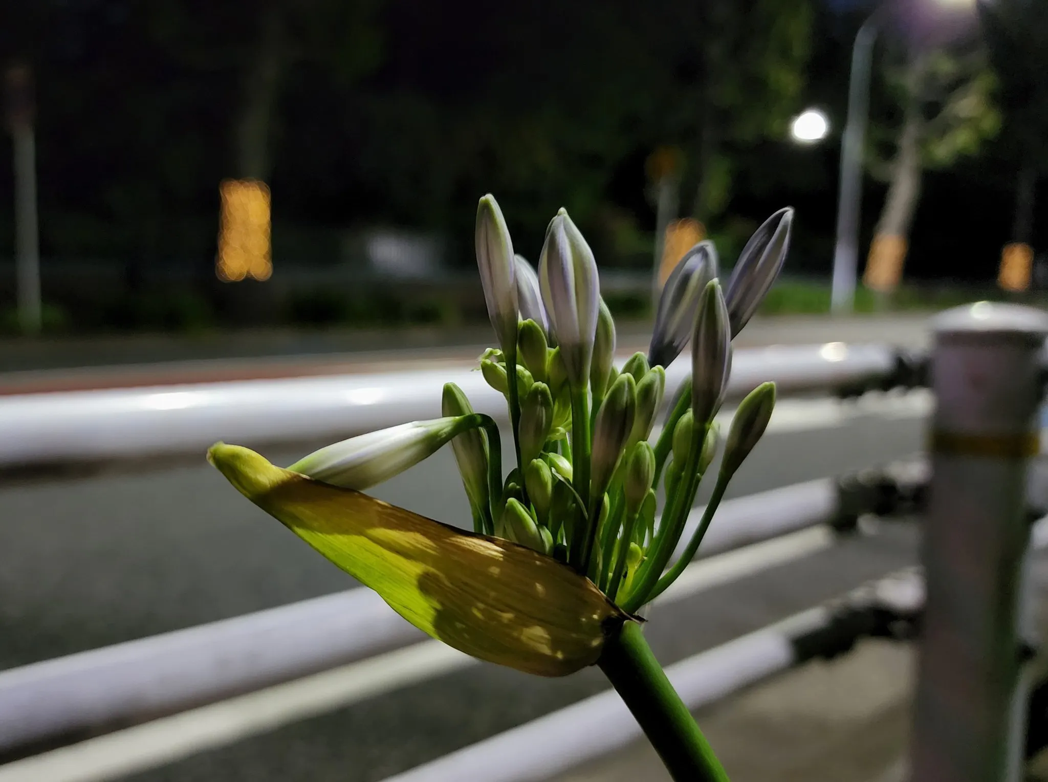 ふくろう広場で咲こうとするアガパンサスの背景にイルミネーション…。西千葉ゆりの木通りにある「緑」「花」「公園」そして「イルミネーション」によって、住みやすく・学びやすい《西千葉》の魅力がアップしています。
