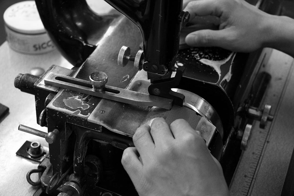 革の厚みを0.1mm単位で調整する革小物作りの重要な工程。