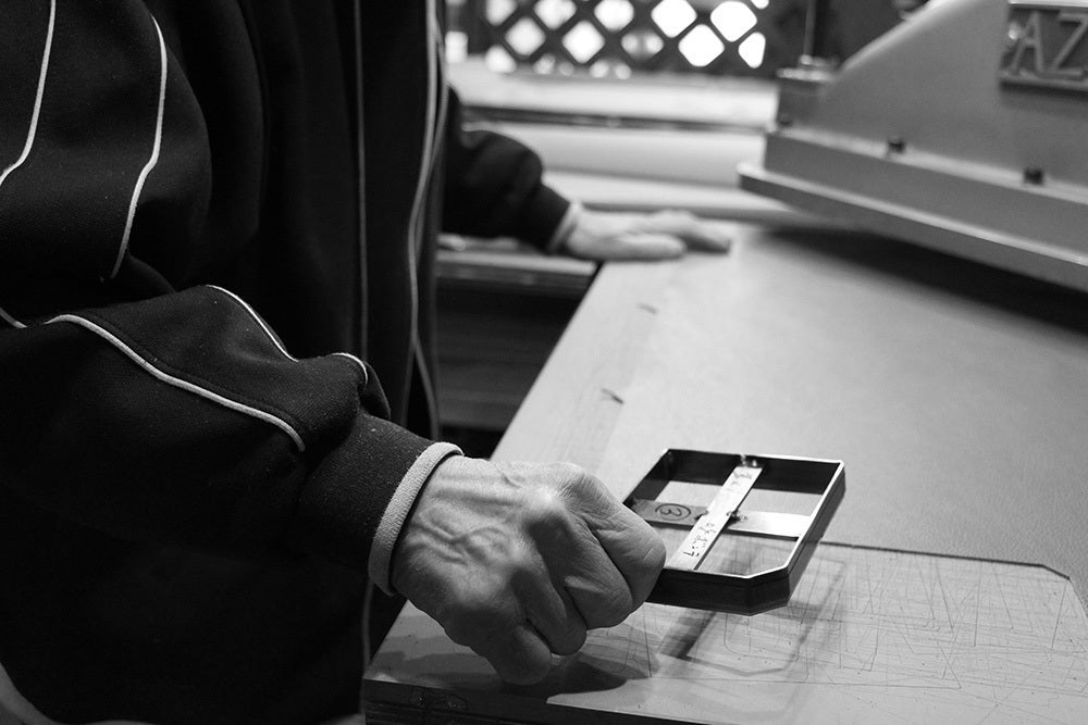 牛革の地キズ等を避け均一の製品を作るために、長年の経験からパーツを裁断していきます。