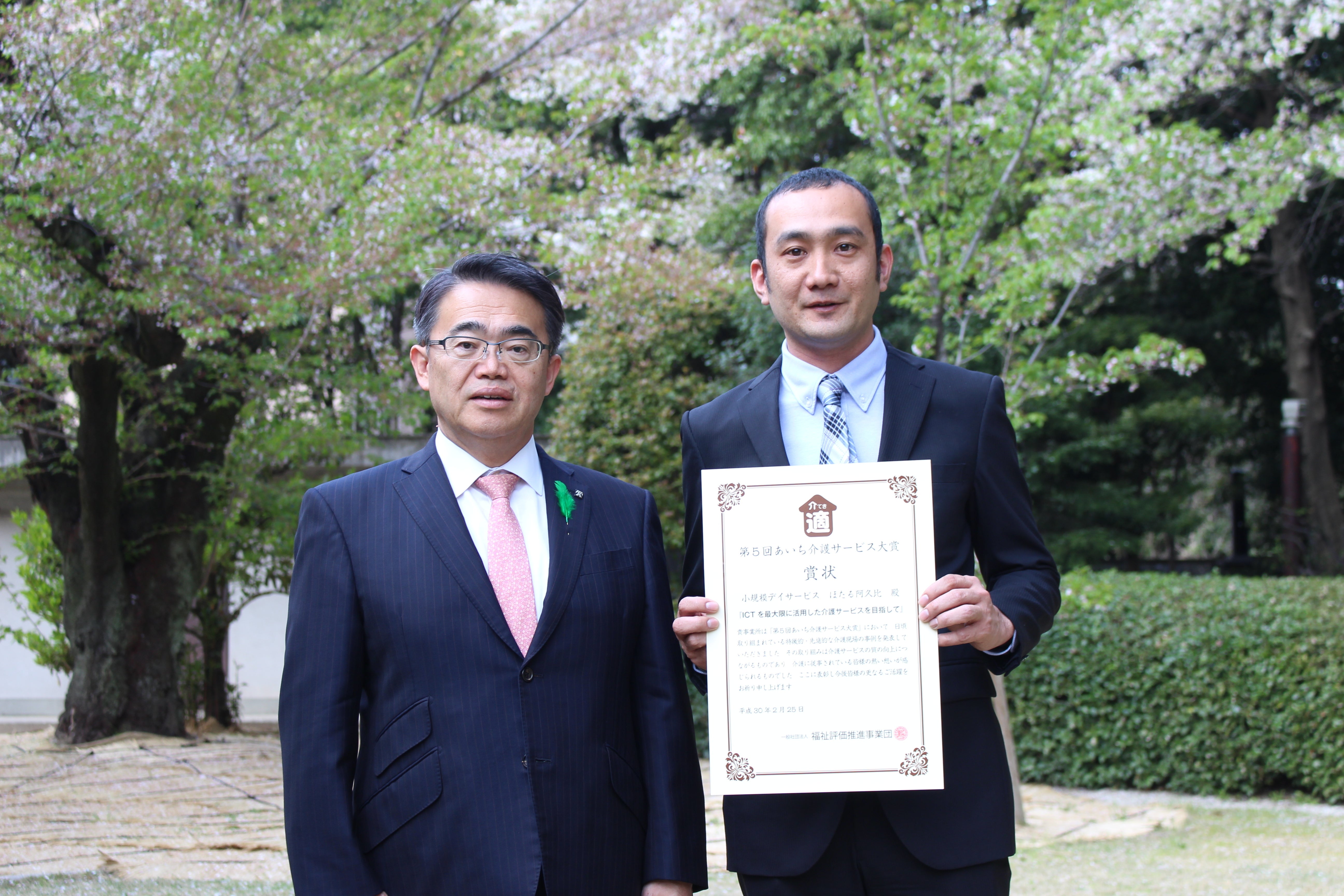 あいち介護サービス大賞入賞時に大村愛知県知事と代表布目裕貴