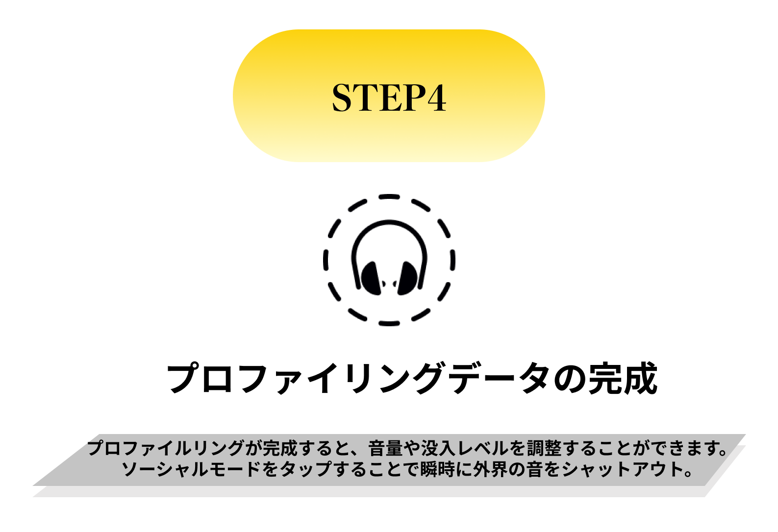 スマートフォンやタブレットに専用アプリをダウンロードし、簡単にあなたの聴覚プロファイルを作成することができます。一度プロファイルを作成すればそれ以降はすぐにオーダーメイドサウンドを聴くことが可能です。もう一度、聴覚プロファイルを作成する必要はありません。