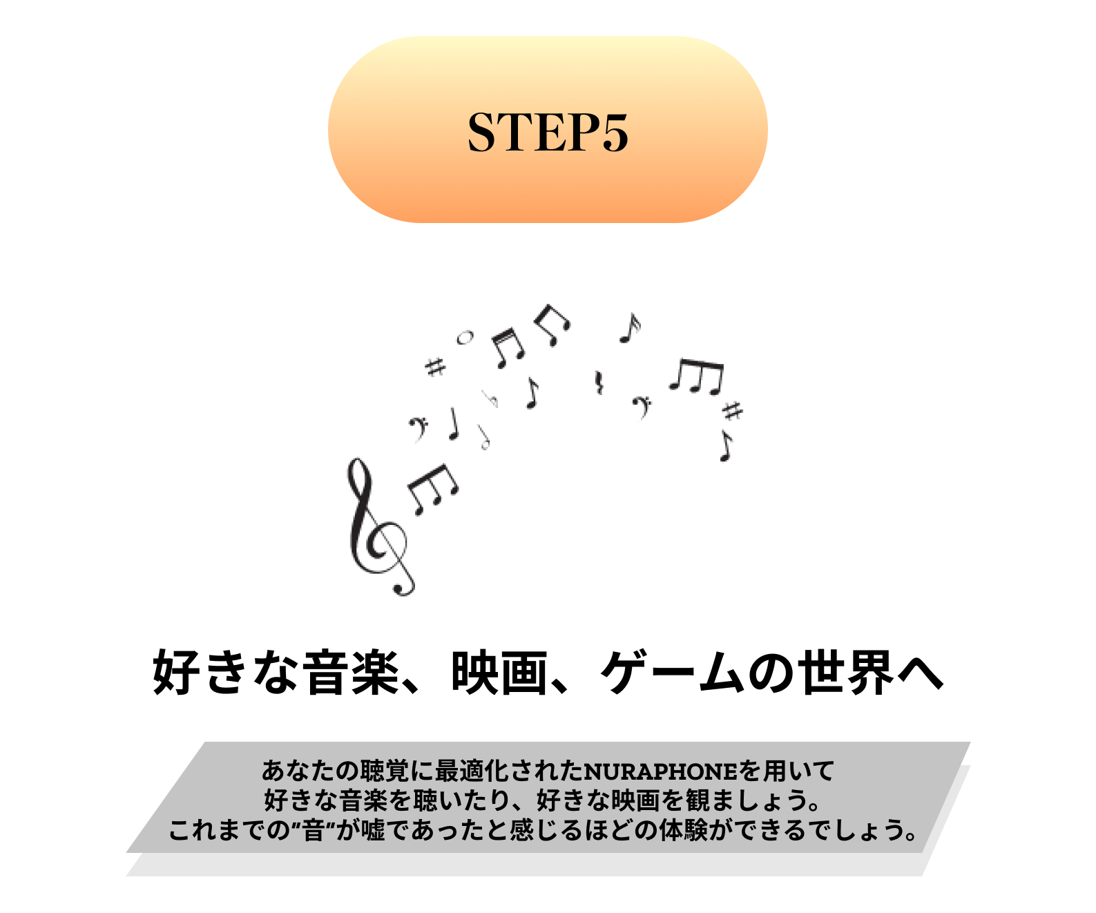 NURAPHONEに使われている技術は、新生児の聴力検査にも利用されている確かな技術で、音波を放出し内耳から返ってきた反響音からあなたの聴力を自動測定します。測定したデータを解析し、あなたの聴覚にあった“生まれて初めての音体験”を提供することに実現した世界初のヘッドフォンになります。