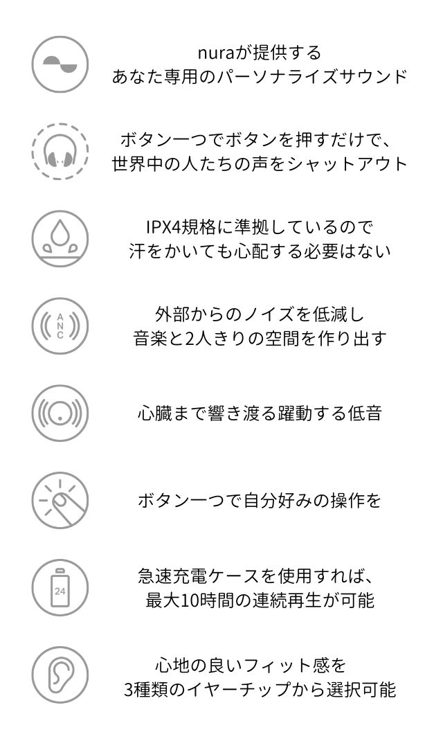 NURAPHONEとNURABUDSの二つのプロダクトを持ち合わせることで、あなたと音楽の2人きりの空間を作り出す圧倒的な没入感・LIVE会場のように心臓まで響き渡る低音、nuraが提供する“生まれて初めての音体験”をさまざまな場面で楽しむことが出来るようになります。