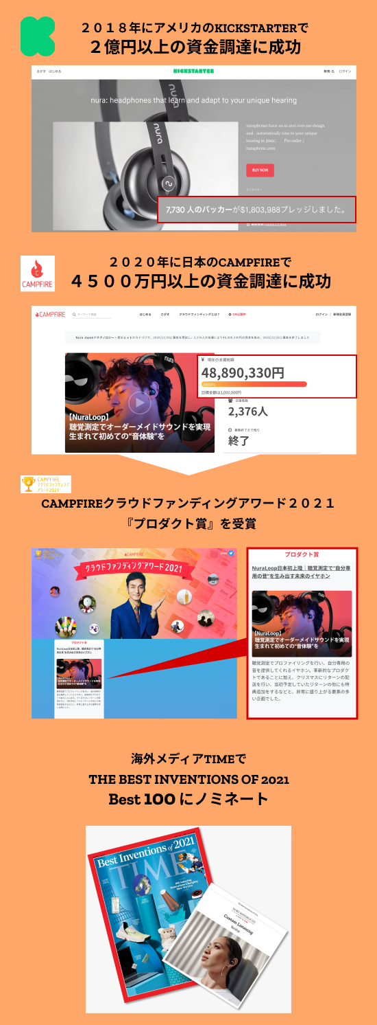 NURAPHONEは、米国のクラウドファンディングサービスKICKSTARTERにて約180万ドル(約1億9000万円)の資金調達に成功しています。