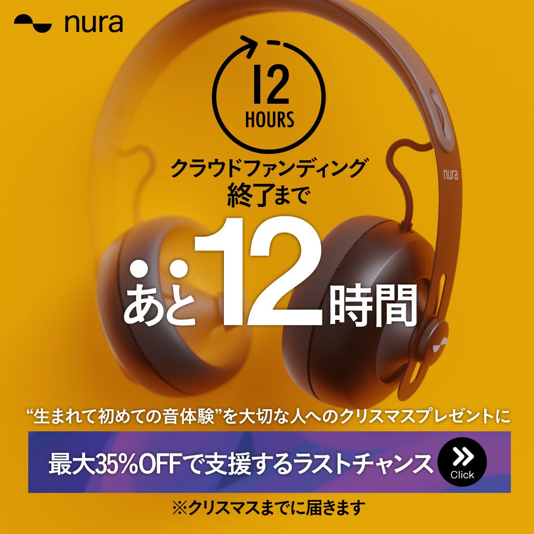 2021/12/20 12:00こんにちは!nura teamのTaylorです!NURAPHONE×NURABUDSのクラウドファンディングも残すところ、あと12時間となりました。つい先ほど、目標金額の『600%』を達成致しました!最終日の最後の最後まで、みなさん応援・支援本当にありがとうございます。みなさんが、nuraを応援してくださっている事、我々nura team一同、とても嬉しく思います!本当にありがとうございます!NURAPHONE×NURABUDSのセットをクリスマスに最安値でみなさんにお届けするのは、今回が最初で最後になるかと思います。ほとんどの人が体験したことのない、聴覚を自動で測定・解析して、自分専用のオーダーメイドサウンドから作り出される“生まれて初めの音体験”をクリスマスまでに、あなたへお届けいたします。まだ、nuraが誇るオーダーメイドサウンドのイメージがつかないという方は、下記動画を視聴してみてください!(既にプロジェクトページにて紹介させていただいていますが、再度動画を貼らさせていただきますね)↓日本を代表する有名フリースタイルラッパーの『晋平太』さんのレビュー動画になりますnura製品を手にした時の感動体験を私の目では確認することはできませんが、多くの人が初めて装着したときに、「こんな音聴いたことない!」「本当にLIVE会場にいるみたい」と感想を言っていただける自信はあります!ですので、この機会に最高音質・体験を味わうことができるnura製品を手に取って、最高のクリスマスを過ごしてくださいね。“自分専用のオーダーメイドサウンド”を最大35%OFFで手にする>>それでは!ps些細ではありますが、nuraから感謝を込めて支援者限定でプレゼント企画を実施しております。プレゼント内容は、こちらから確認することができますので、まだチェックしていないという方は、残り時間も限られていますので、お早めにチェックしてくださいね。TaylorFull Color Sound Support The nura Team もっと見る
