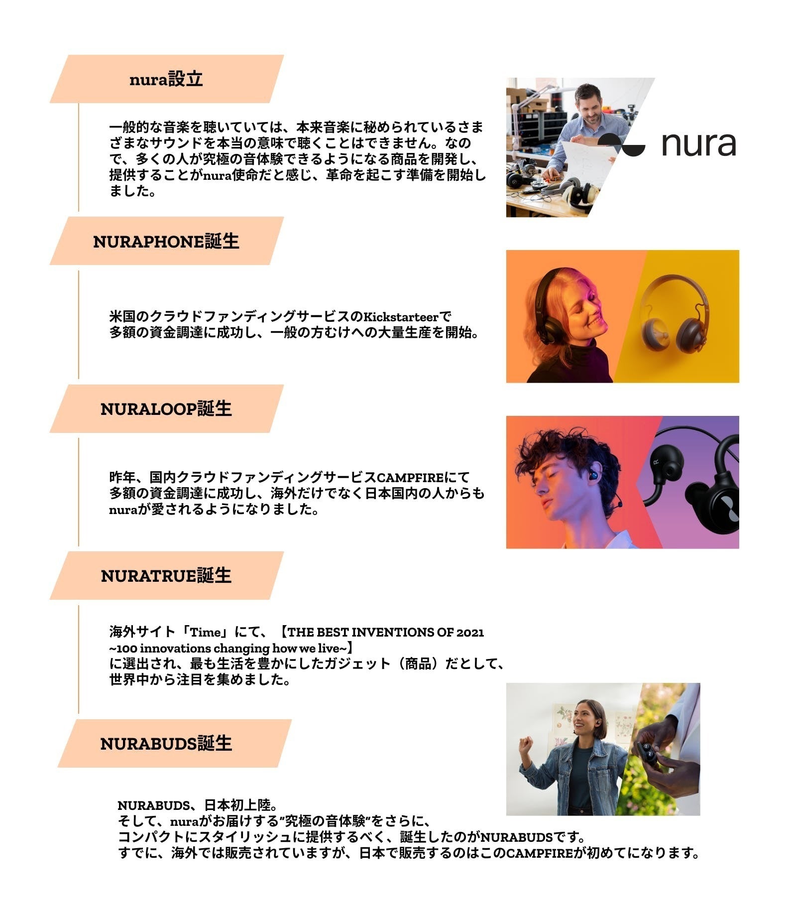 nuraは、世界初の最先端技術を搭載したイヤフォンやヘッドフォンを製造し、あなただけの“オーダーメイドサウンド”を提供する企業です。我々が開発した世界初のイヤフォン・ヘッドフォンは、クラウドファンディングサービスKICKSTARTER・CAMPFIREで多くの方から支援していただき、多くの資金を調達することができました。そして、今回はクリスマスキャンペーンという事で、ここCAMPFIREにて特別価格でnuraをみなさんに手に取っていただきたいと思っています。日本初上陸の新商品についても案内がありますので、ぜひそこのチェックもしてみてください!