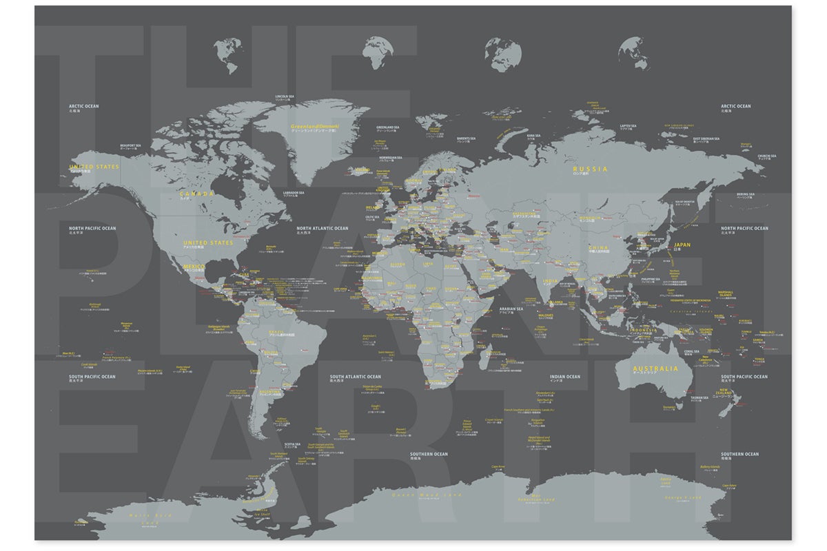 いっぽう、ある程度離れた場所遠からこの地図を見た時のための(日常ではその方が多いと思いますが)、もうひとつの眺めとして、ポスター全体に「THE PLANET EARTH」(この惑星地球)という英文字を大きく敷き詰めています。