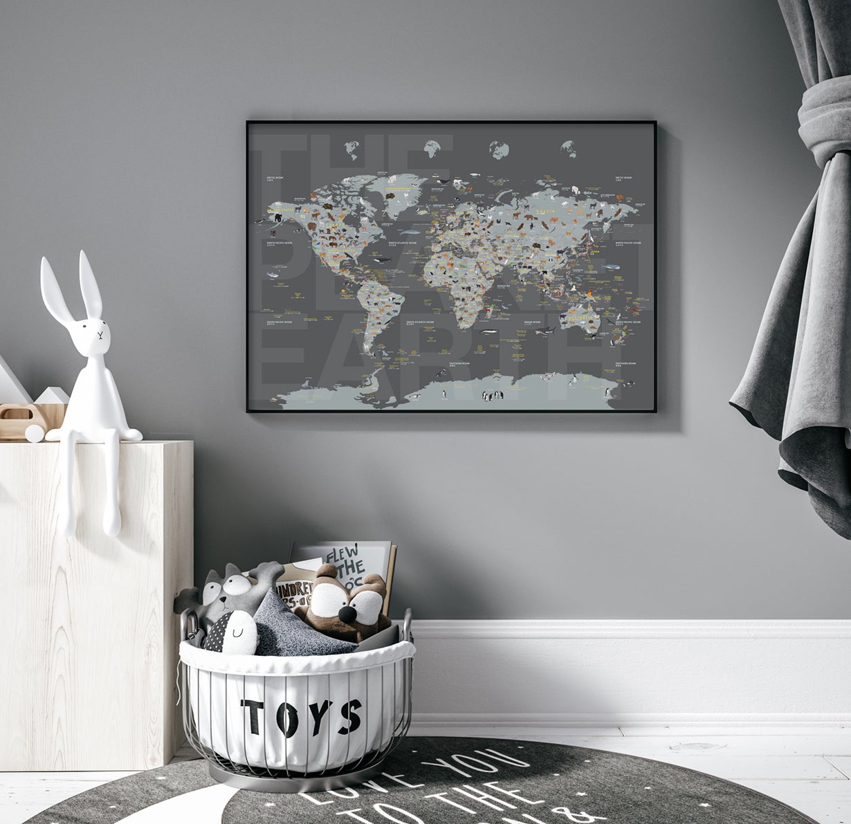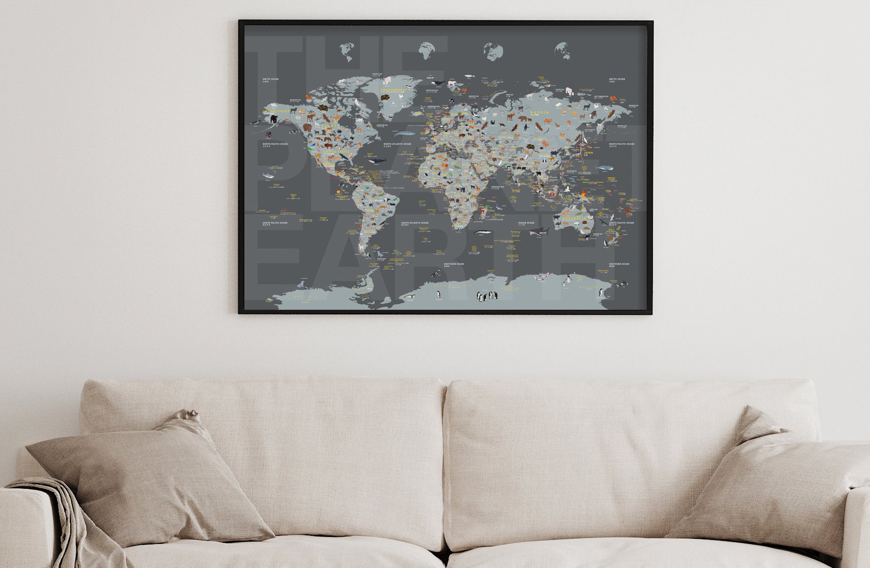 「どうぶつせかいちず」と、「インテリアのための世界地図」は、壁に掛けるか、または、床に置いて壁に立て掛けるだけで、日常の風景を圧倒的なまでに、おしゃれな空間に変えてしまうことでしょう!