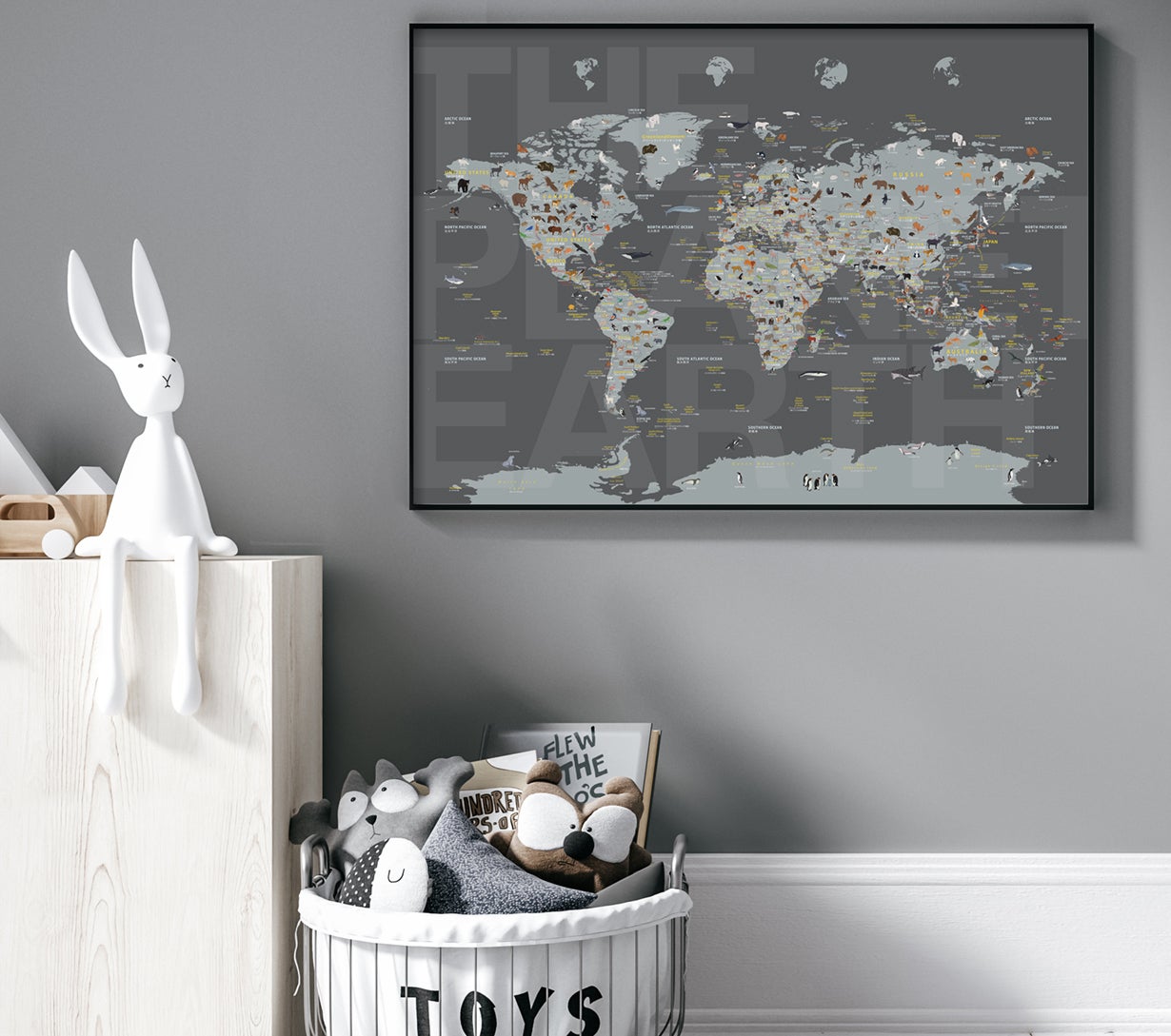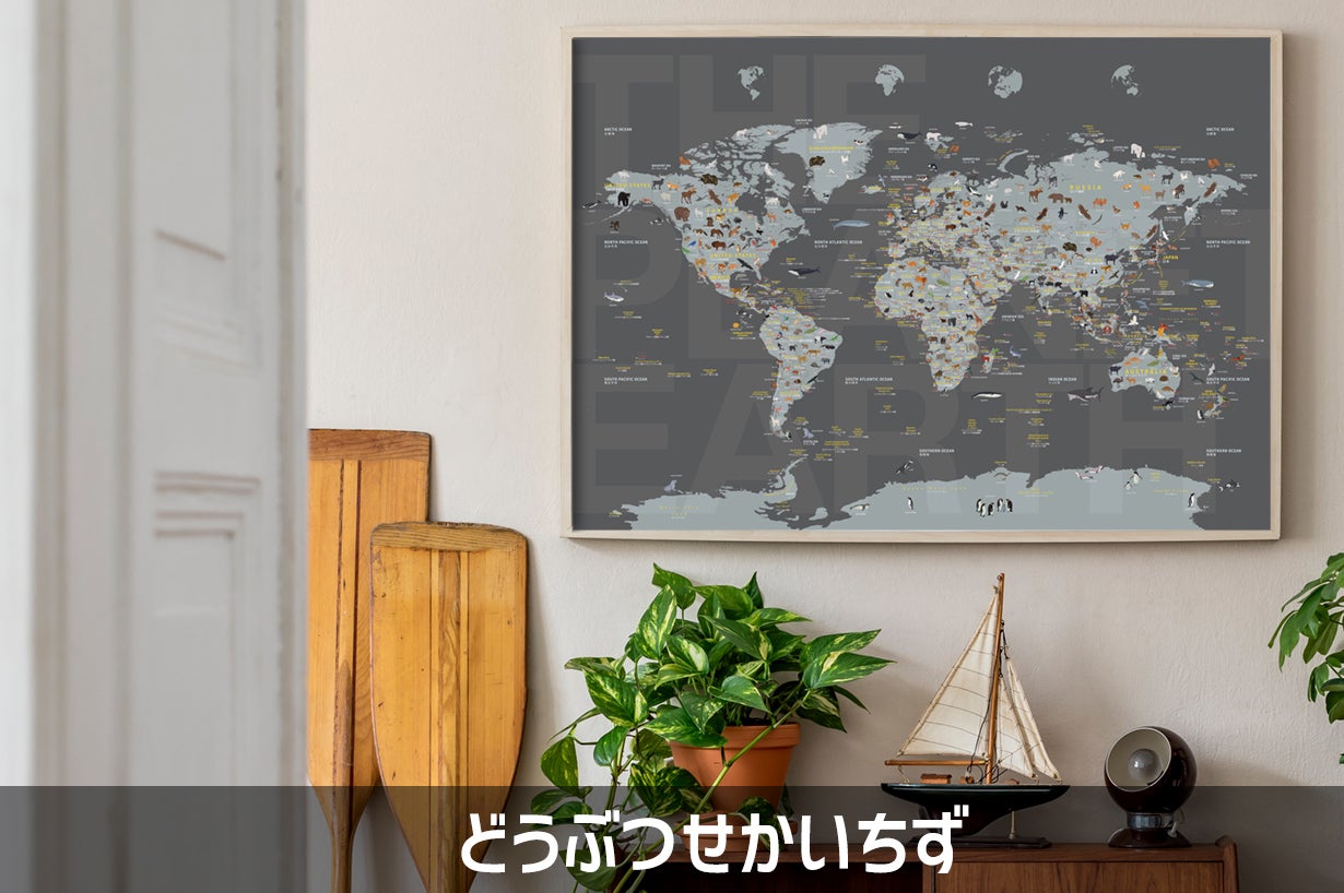 「どうぶつせかいちず」と、「インテリアのための世界地図」は、壁に掛けるか、または、床に置いて壁に立て掛けるだけで、日常の風景を圧倒的なまでに、おしゃれな空間に変えてしまうことでしょう!