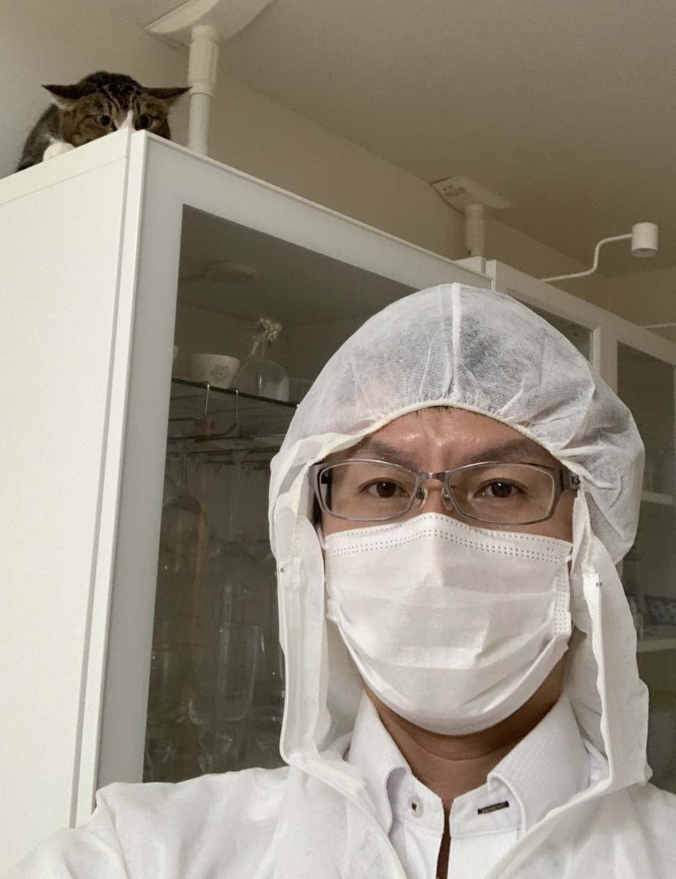防護服を着て留守宅の愛猫をお世話してくれた山本さん