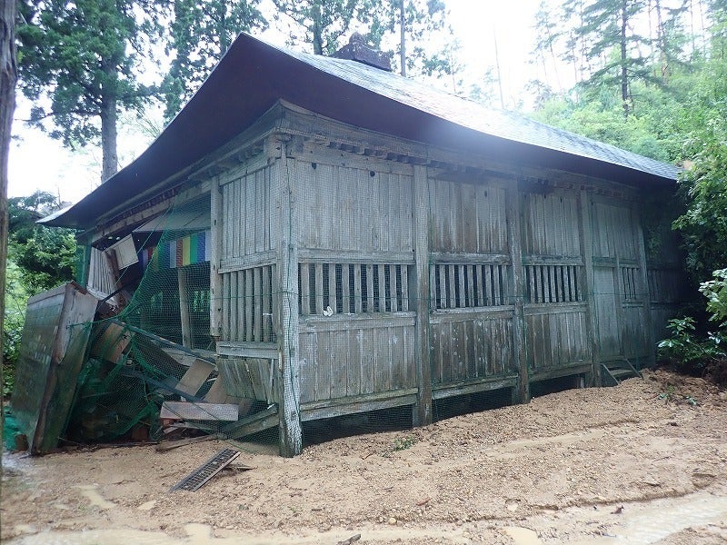 裏山からの土砂により前方に押し出されたお堂。一部倒壊している