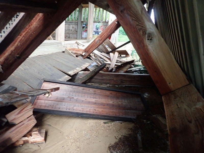 お堂の背面に押し寄せた土砂そのため、すべての支柱が礎石から外れ、建物がゆがみ、壁や床が外れ落ちました。