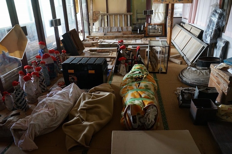そのため、文化財を堂内から緊急避難させ、旧コミュニティセンターに輸送しました。