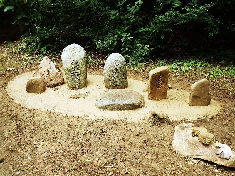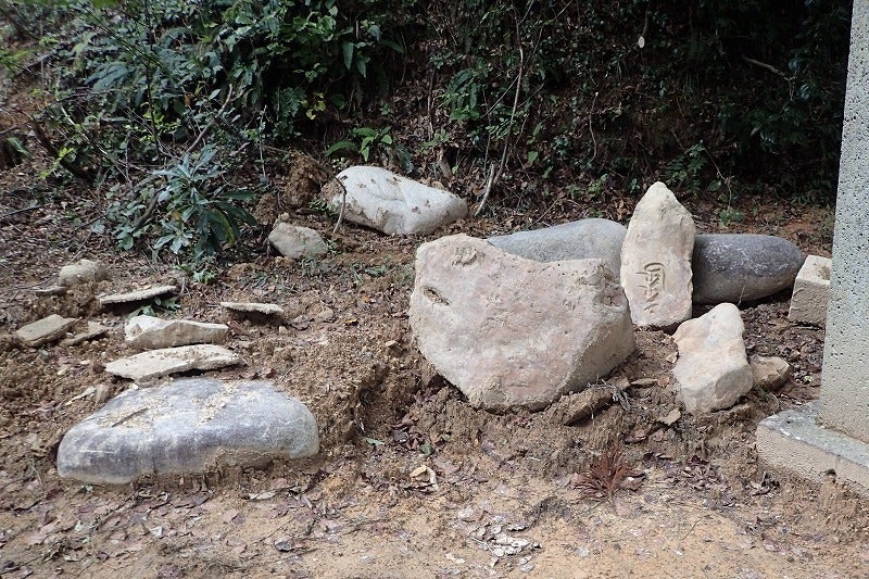 裏山の斜面は土砂崩れによって広範囲が裸山になり、大量の土砂が流出し、周辺に建立されていた石碑も土砂に押し流されました。