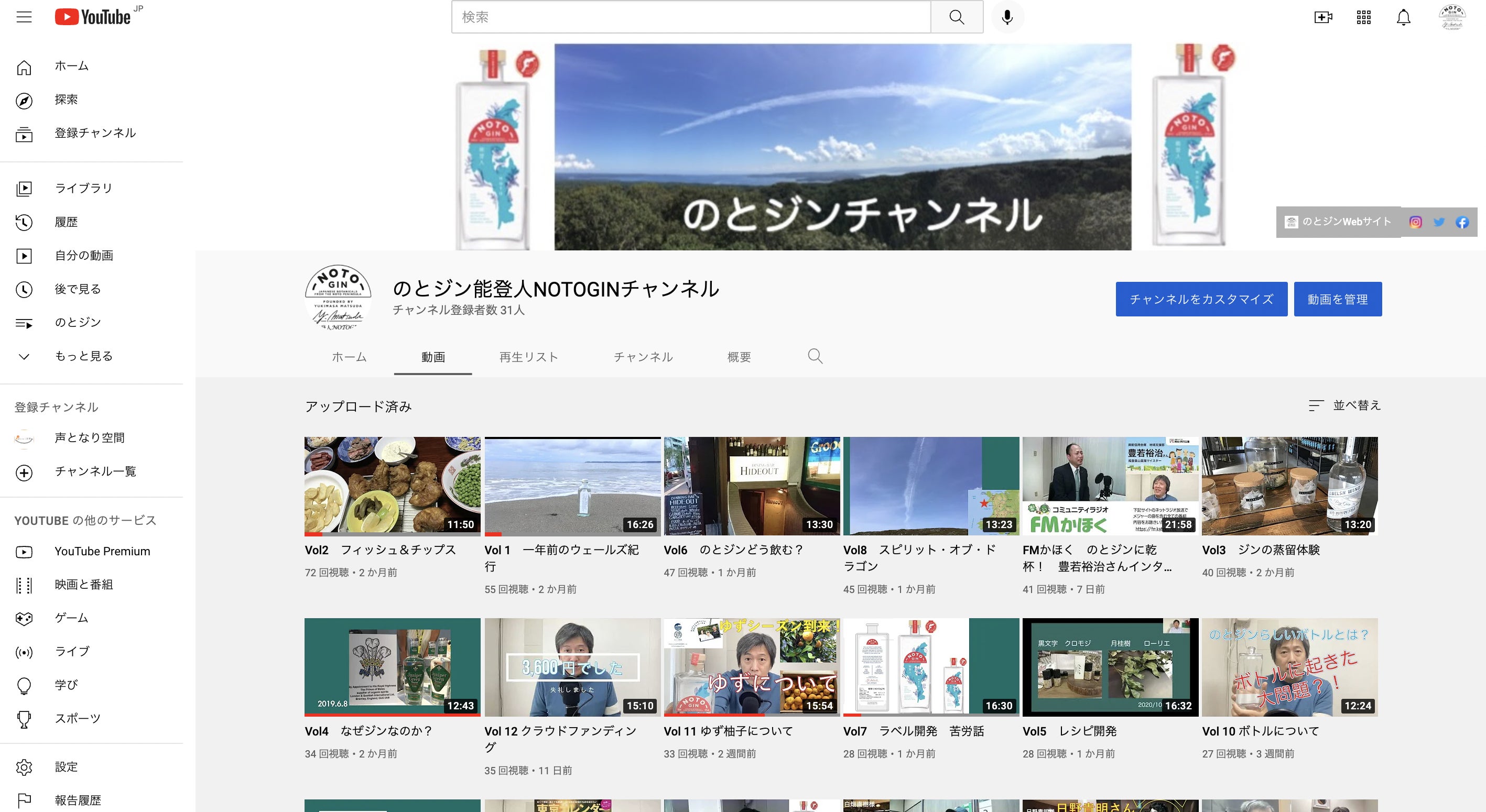 「のとジンチャンネル」には、再生リストが2つあり、「のとジン」と「FMかほくのとジンに乾杯!」になっています。主に、「のとジン」の方に、製品についての情報がございます。